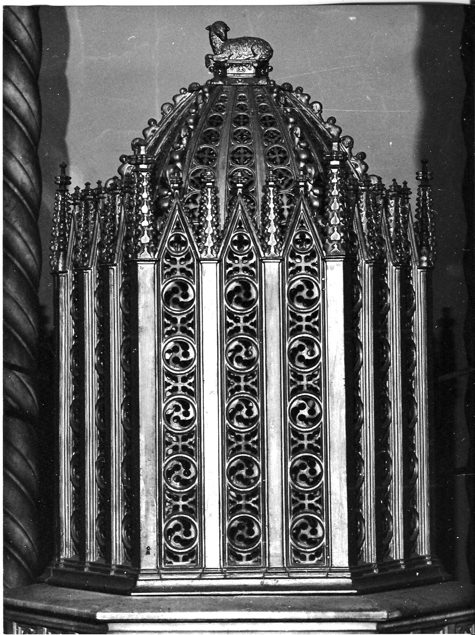 Coperchio del fonte battesimale, esagonale, definito da una struttura a lesene cuspidate (4 per lato), tra cui sono poste bande verticali decorate a motivi circolari terminanti con timpani profilati di piccoli motivi vegetali