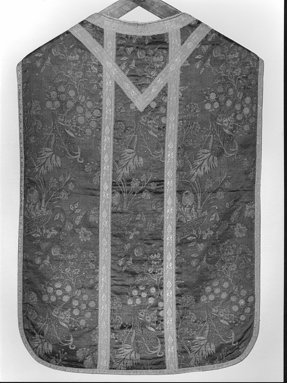 Paramento liturgico composto da pianeta, stola e borsa. Il disegno è caratterizzato dallo sviluppo verticale dei tralci fioriti e sinuosi con foglie, alcune delle quali, con bordi ripiegati