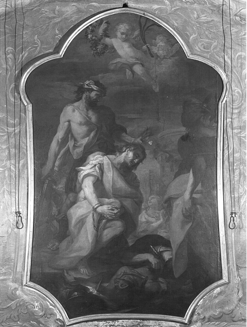 Personaggi: San Maurizio. Figure maschili: carnefice; guerriero morto; soldato decollato. Figure femminili: donna. Figure: angelo; cherubini. Simboli del martirio: palma; corona di fiori. Oggetti: manette. Armi: spada