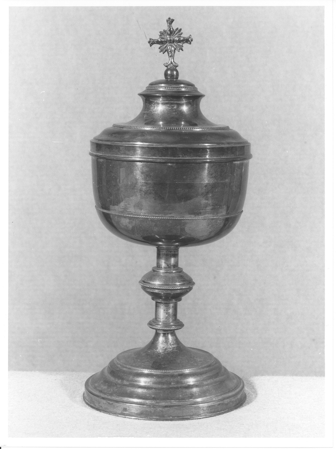 piede circolare, fusto con doppio nodo, coppa liscia, coperchio sagomato con crocetta apicale