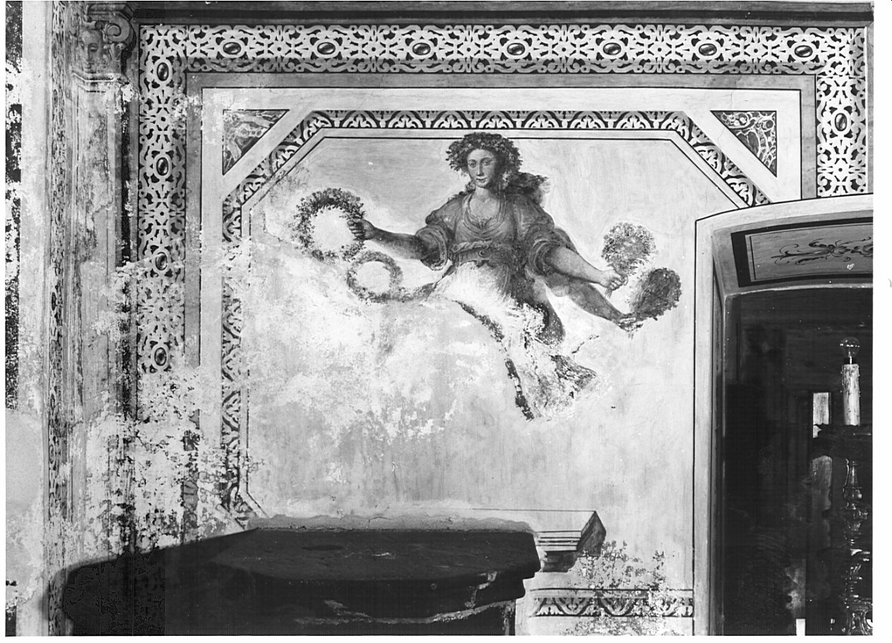 Personificazioni: (autunno) figura femminile; (estate) figura femminile; (primavera) figura femminile; (inverno) figura femminile. Elementi architettonici: basamenti. Attributi: (autunno) fronda di castagno; (estate) arco; freccia; (primavera) ghirlanda di fiori; (inverno) fronda di quercia. Decorazioni: cornici rettangolari a motivi vegetali stilizzati