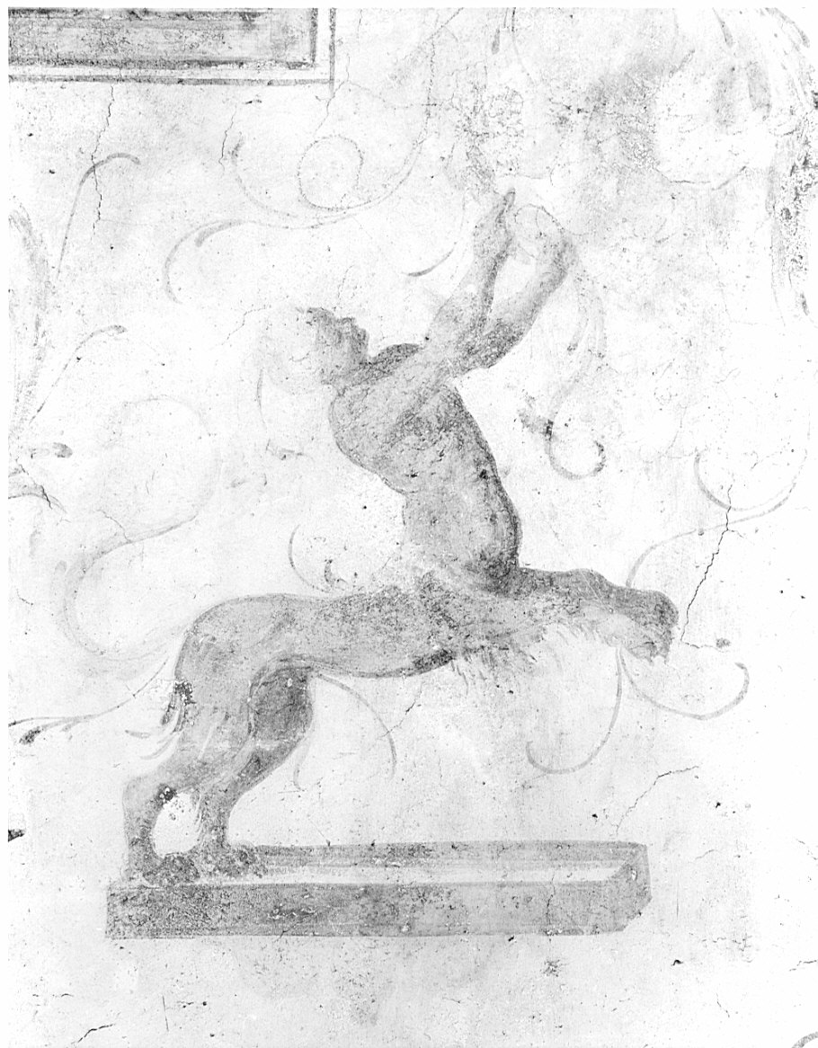 Entro cornice rettangolare spezzata mistilinea si svolge la scena figurata; intorno; entro cornice rettangolare spezzata con motivo geometrico si trovano tralci fioriti e figura femminile a cavallo di un animale fantastico con ali; testa di leone e coda di serpente e mezza figura maschile con corpo leonino