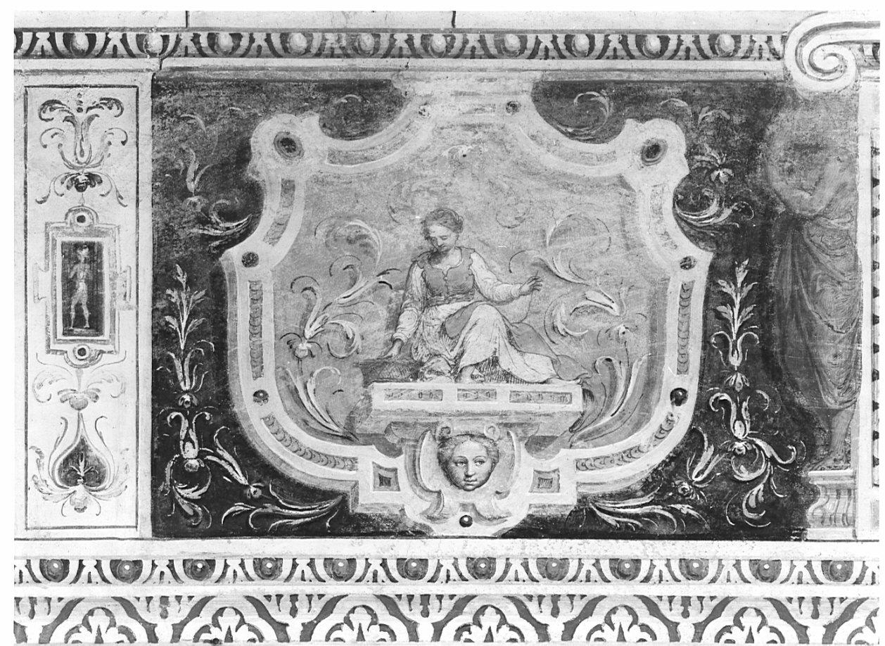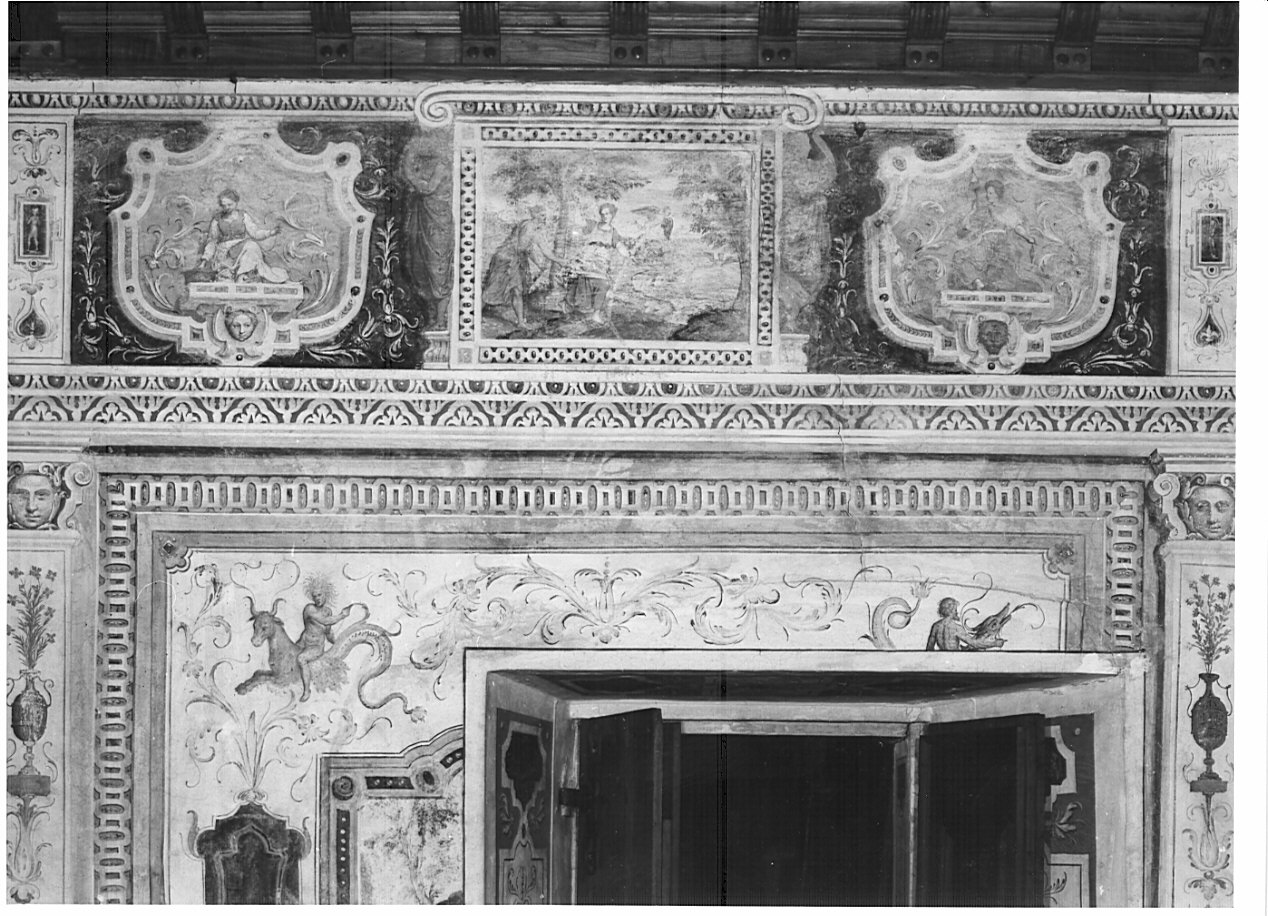 Entro cornici rettangolari fiancheggiate da figure - cariatidi di profilo ed entro specchiature mistilinee con tralci fioriti si svolge la scena; ai lati vi sono specchiature mistilinee con tralci fioriti e figure