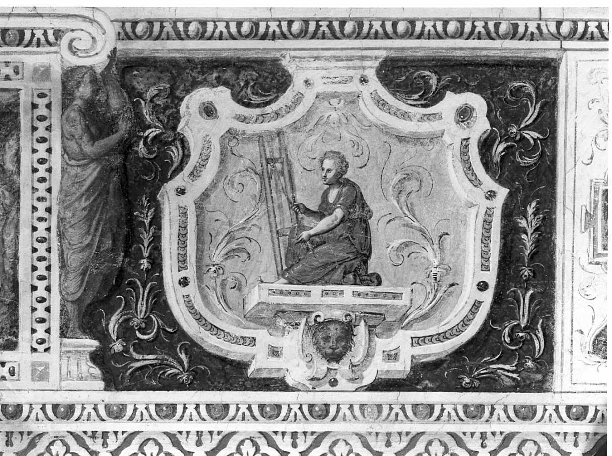 Entro cornici rettangolari fiancheggiate da figure - cariatidi di profilo ed entro specchiature mistilinee con tralci fioriti si svolge la scena; ai lati vi sono specchiature mistilinee con tralci fioriti e figure