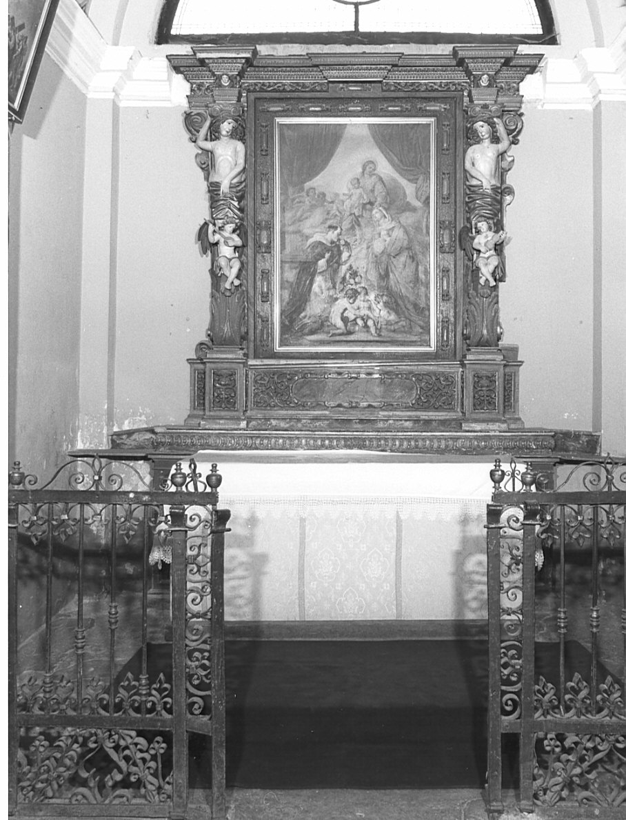 Altare costituito da mensa e ancona decorata con angioletti e telamoni