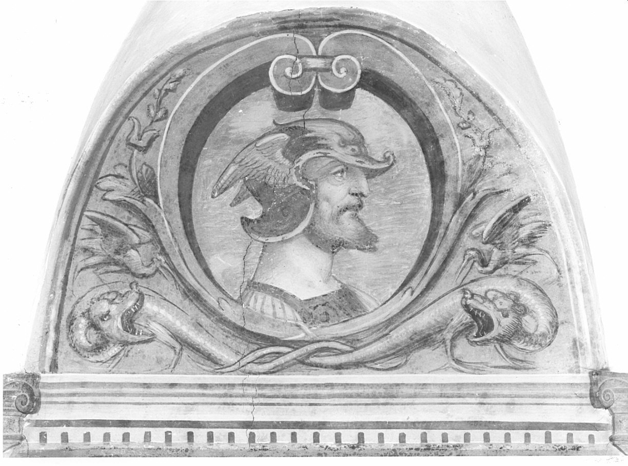 Figure maschili: mezzobusto di profilo. Animali fantastici. Abbigliamento: elmo. Decorazioni