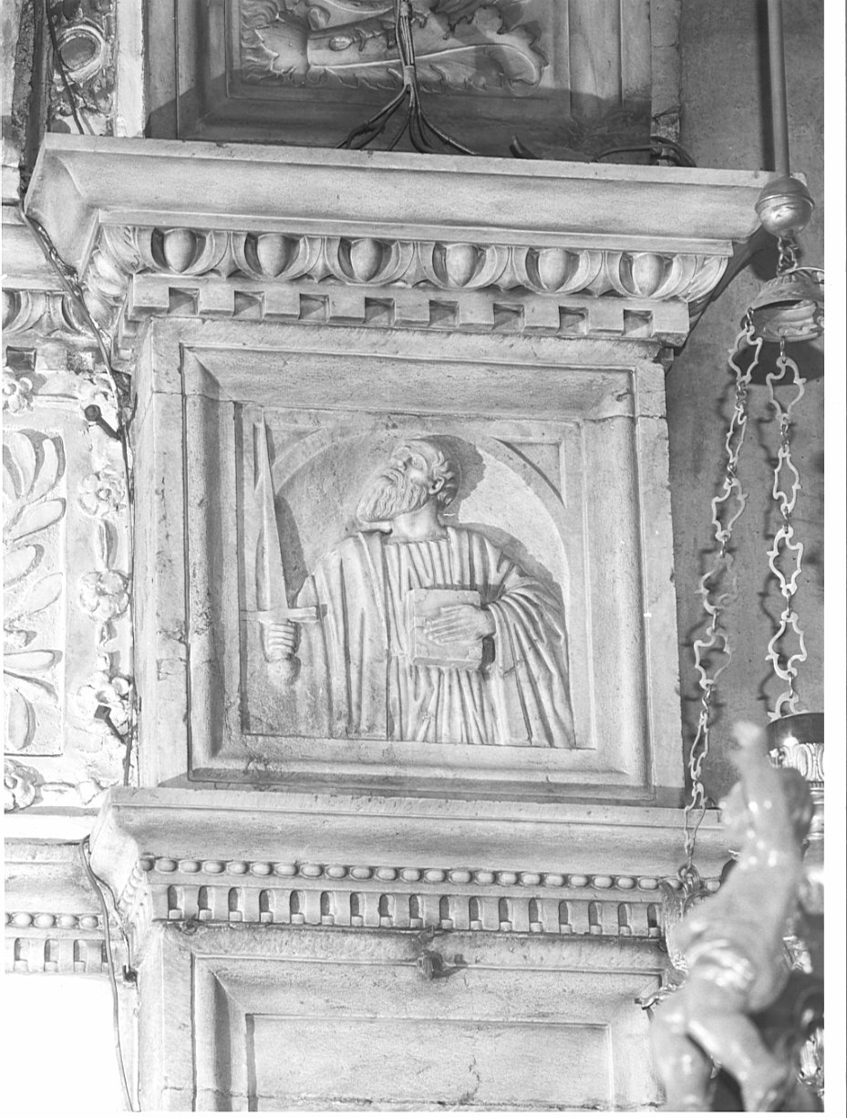 Formella con cornici superiori aggettanti a ovoli e dentelli. Lato frontale con formella quadrata iscrivente un tondo con la figura