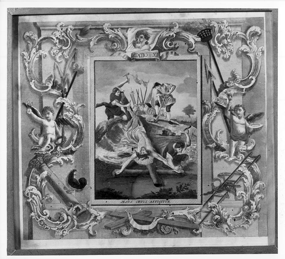 - ISCRIZIONI Bordo superiore e inferiore del riquadro centrale - STATIO XI/ JESUS CRUCI AFFIGITUR - lettere capitali - latino