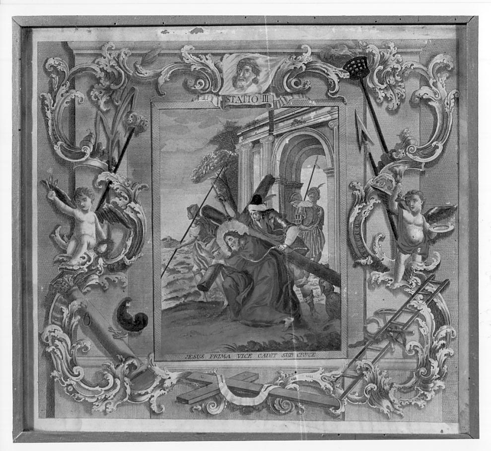 - ISCRIZIONI Bordo superiore e inferiore del riquadro centrale - STATIO III/ JESUS PRIMA VICE CADIT SUB CROCE - lettere capitali - latino