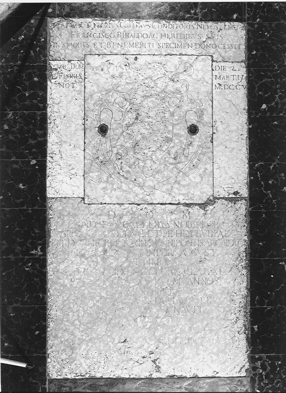 - ISCRIZIONI sulla cornice, ai lati dello stemma e al centro - ... GALLENUS CONDITORIS NEPOS .../ FRANCISCO RINALDO AC HEREDIBUS SUIS/ IN AMORIS ET BENEMERITI SPECIMEN DONO CESSIT/ ... ROG. DOM./ ... FLORIS/ NOT(ARIUS) - lettere capitali - a solchi -
