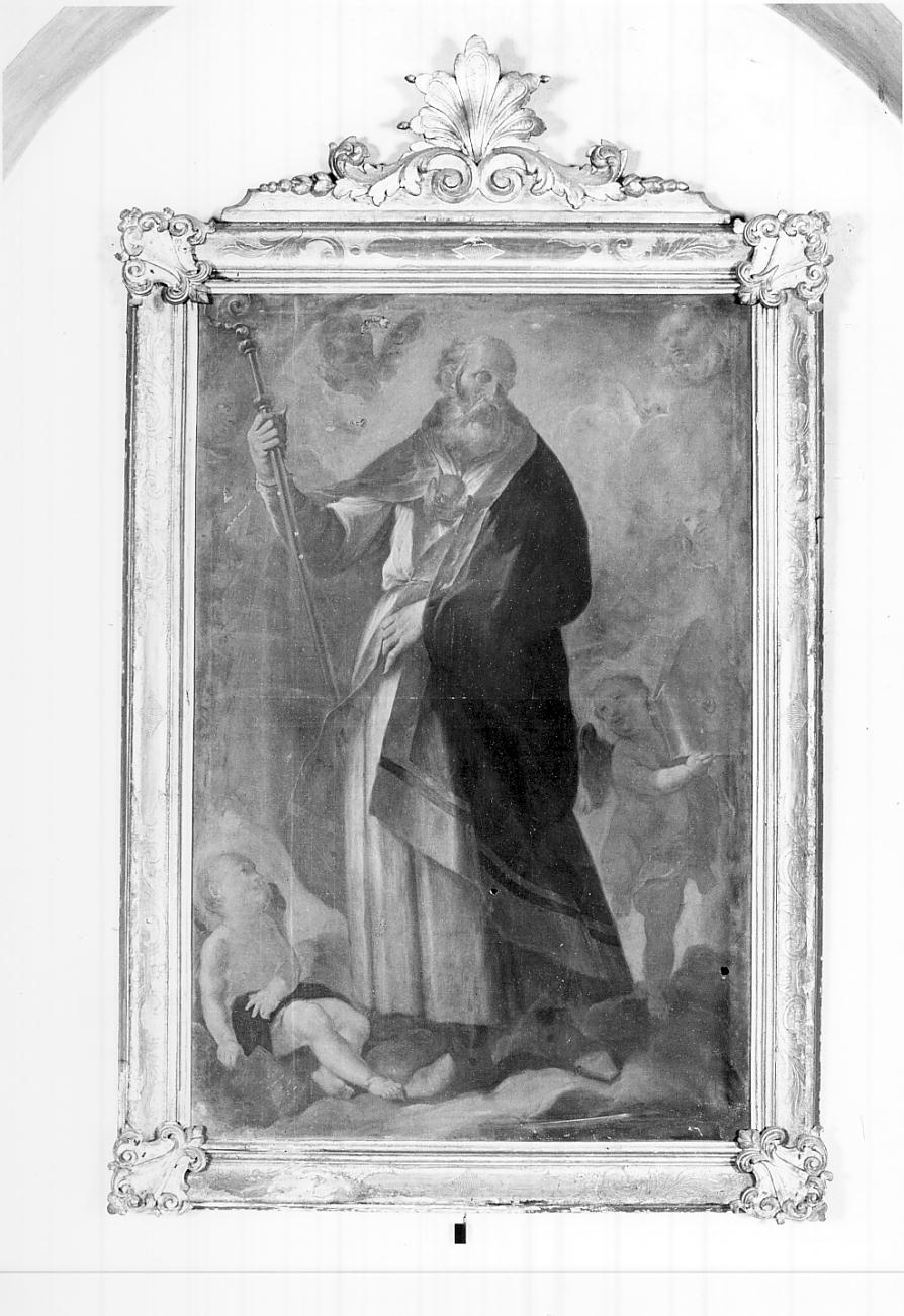 Il santo al centro in abiti vescovili, col pastorale nella mano destra, in basso a sinistra angioletto seduto con strumento del martirio, a destra angioletto in piedi con la mitra in mano