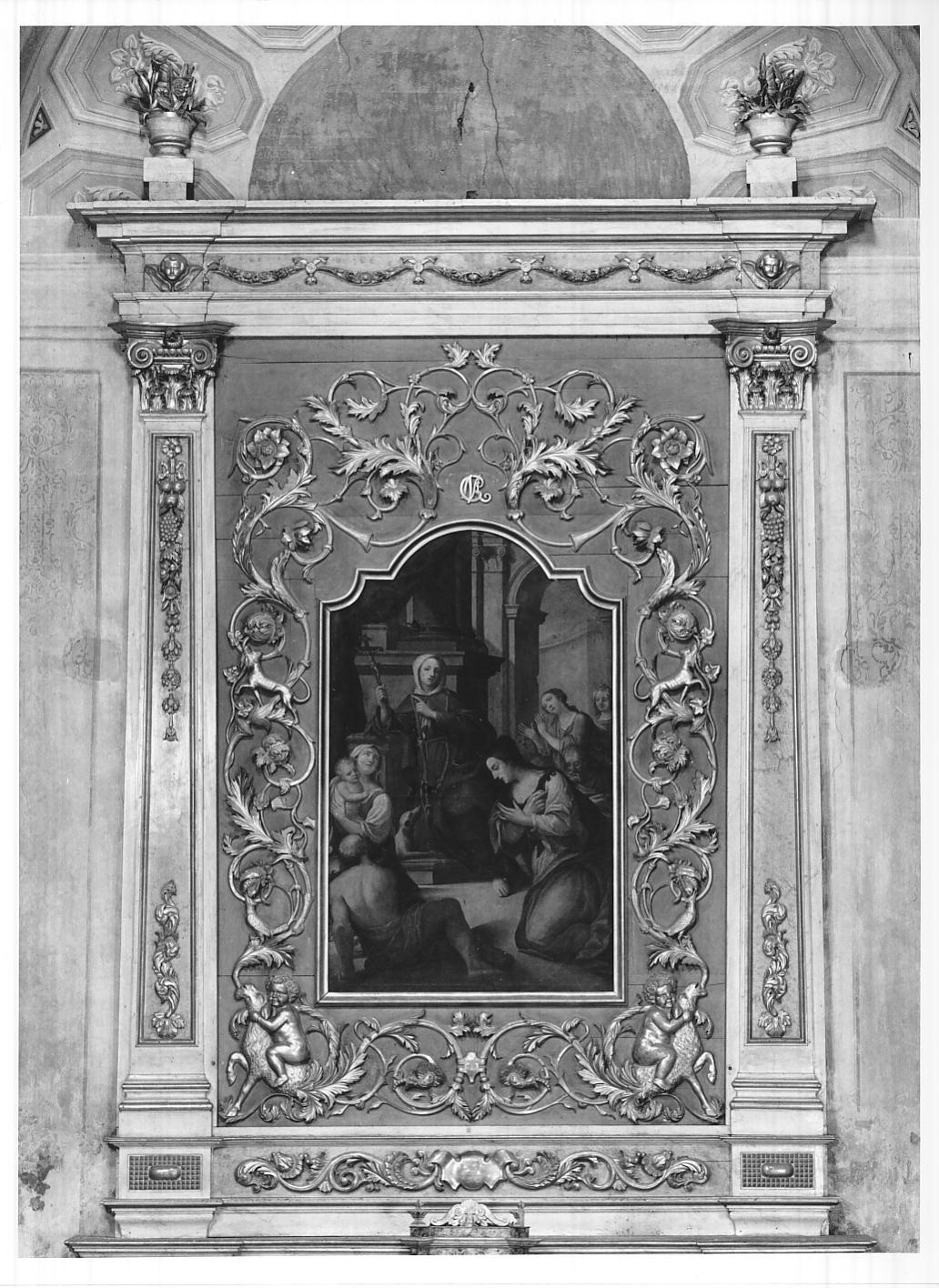Fascia decorativa inferiore con volute vegetali, fiori, perline e cartigli o mistilineo centrale; base delle lesene con decorazione a punte di diaman te e olive sormontata da basamento modanato; specchiature delle lesene con all'interno tralci vegetali e festoni di fiori e frutta; capitelli corinz i; trabeazione modanata con testine angeliche e festoni di fiori, su cui p oggiano due vasi con foglie e fiori; all'interno dell'ancona decorazione a volute vegetali con fiori, perline, putti a cavallo di capre, uccelli che beccano frutti, cani; sopra la cornice del quadro monogramma della santa