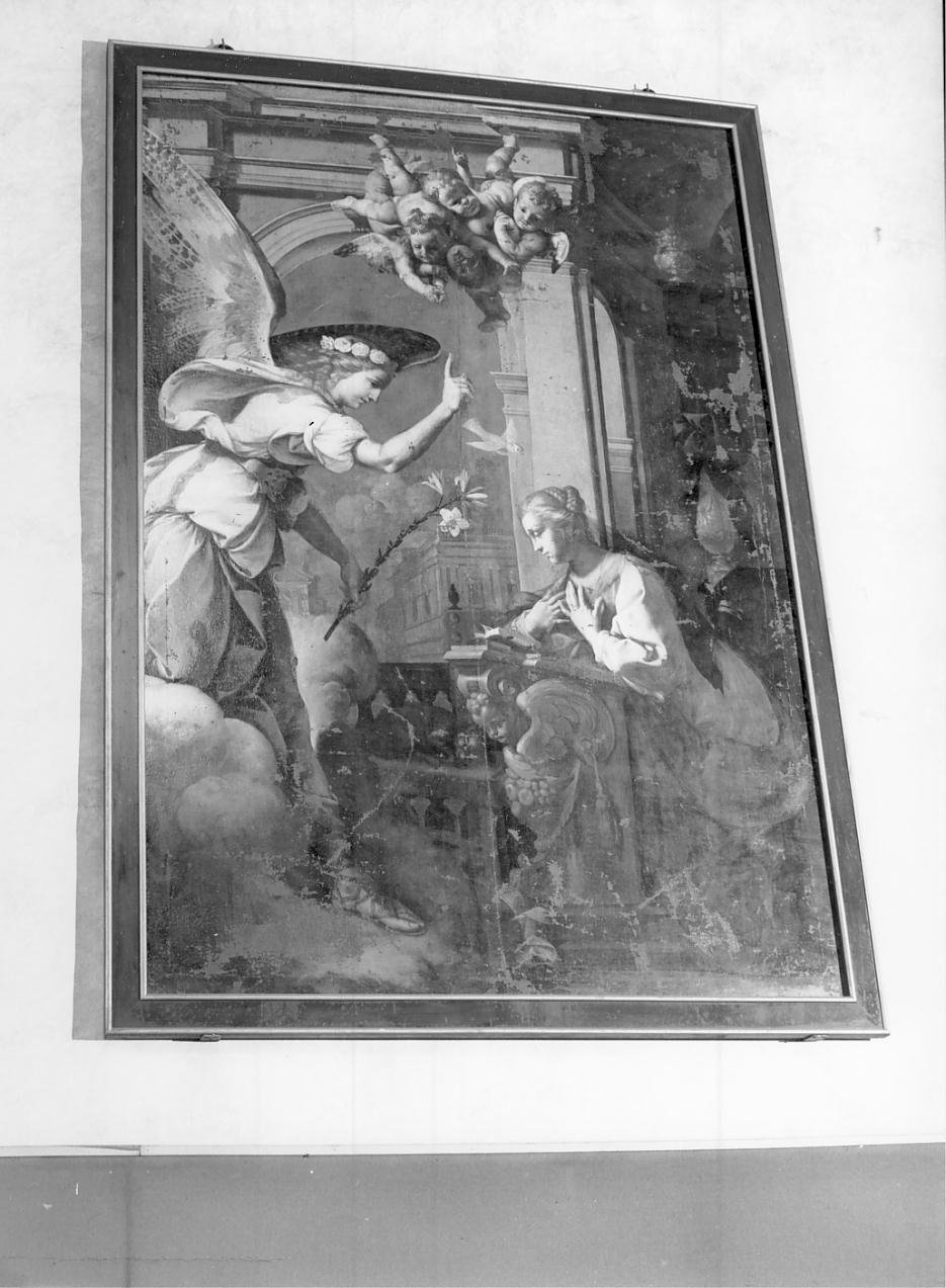 Personaggi: Vergine; San Michele Arcangelo. Figure: angioletti. Attributi: (Vergine) in preghiera riceve l'annuncio dell'angelo; (San Michele) posto a sinistra; coronato di fiori e recante nella mano sinistra il figlio. Paesaggi: La scena si svolge in un ambiente con aperture ad arco entro cui s' intravedono monumentali palazzi e parte della facciata di una chiesa