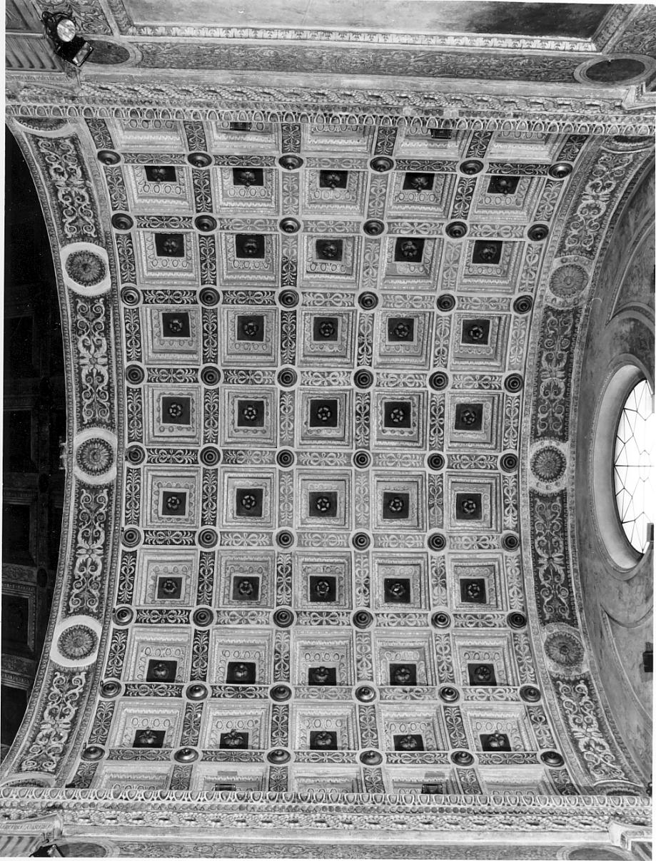volta a botte cassonata con motivi decorativi e rosone al centro dei cassettoni di forma quadrata; fasce decorative con ornati vegetali corrono intorno, intervallate da forme a pigna; sott'archi con motivi arabeschi e tondi simmetrici