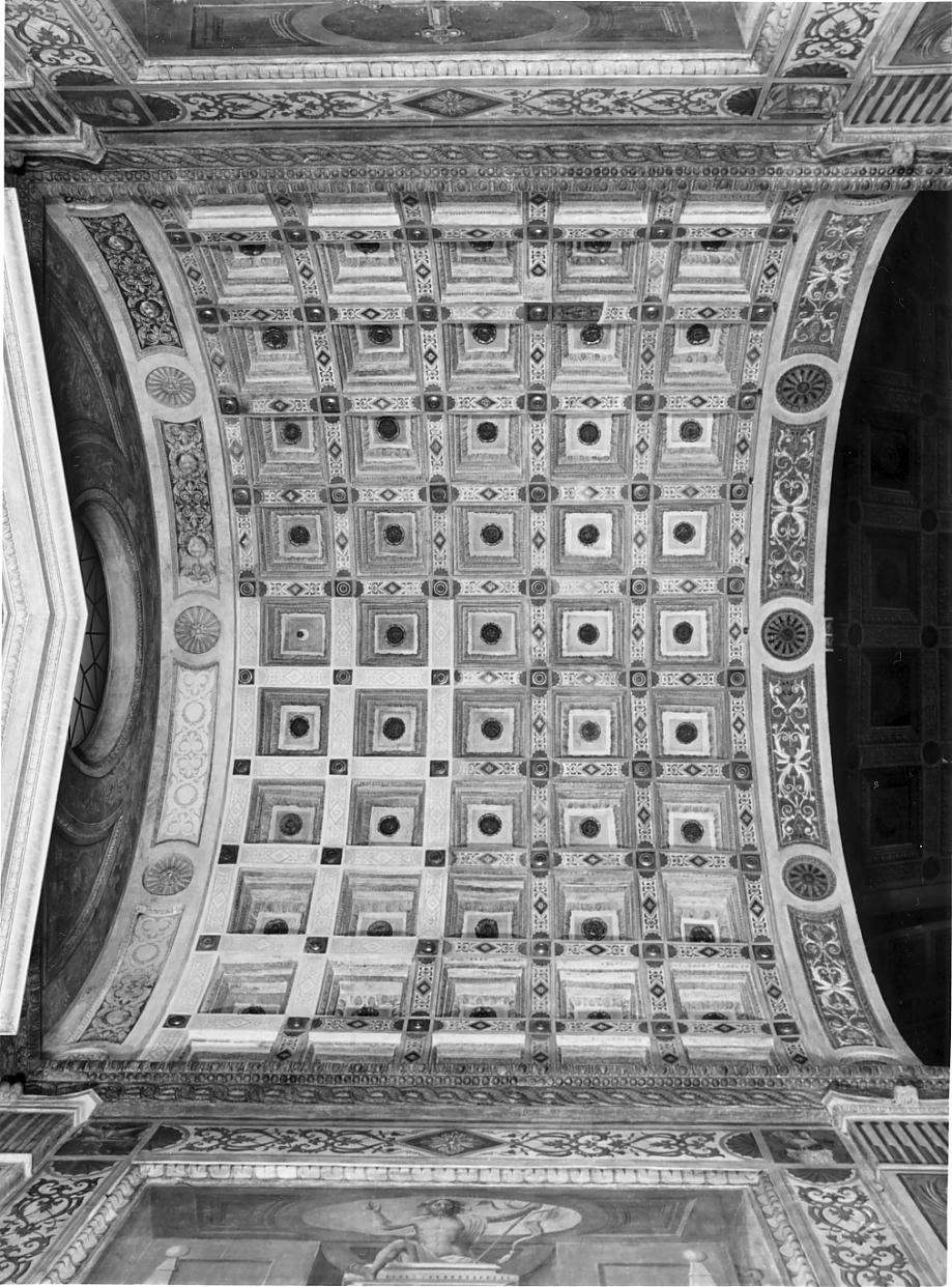 sottarchi con fasce a arabesco intervallate da dischi con motivi floreali; lacunari con cornici in cotto e centro indicato da un fiore in rilievo; l'impianto decorativo che contorna i cassettoni è in parte geometrico, in parte vegetale; dischi a rilievo nei punti di incontro delle fasce