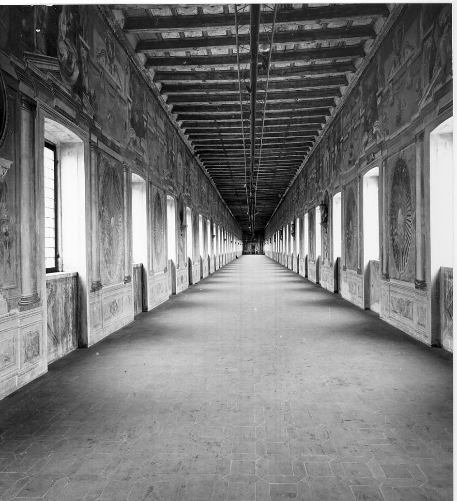 - NOTIZIE STORICO CRITICHE eretta nel 1583-84, la Galleria degli Antichi ricevette in origine una decorazione, perduta, basata su ritratti di uomini illustri. Successivamente, tra il 1586 e il 1587 la decorazione si arricchì delle prospettive terminali opera dei fratelli Giovanni e Alessandro Alberti. Il completamento della Galleria trova discordi opinioni tra gli studiosi, anche se generalmente si tende a collocare la decorazione delle pareti lunghe in epoca successiva a quella vespasianea