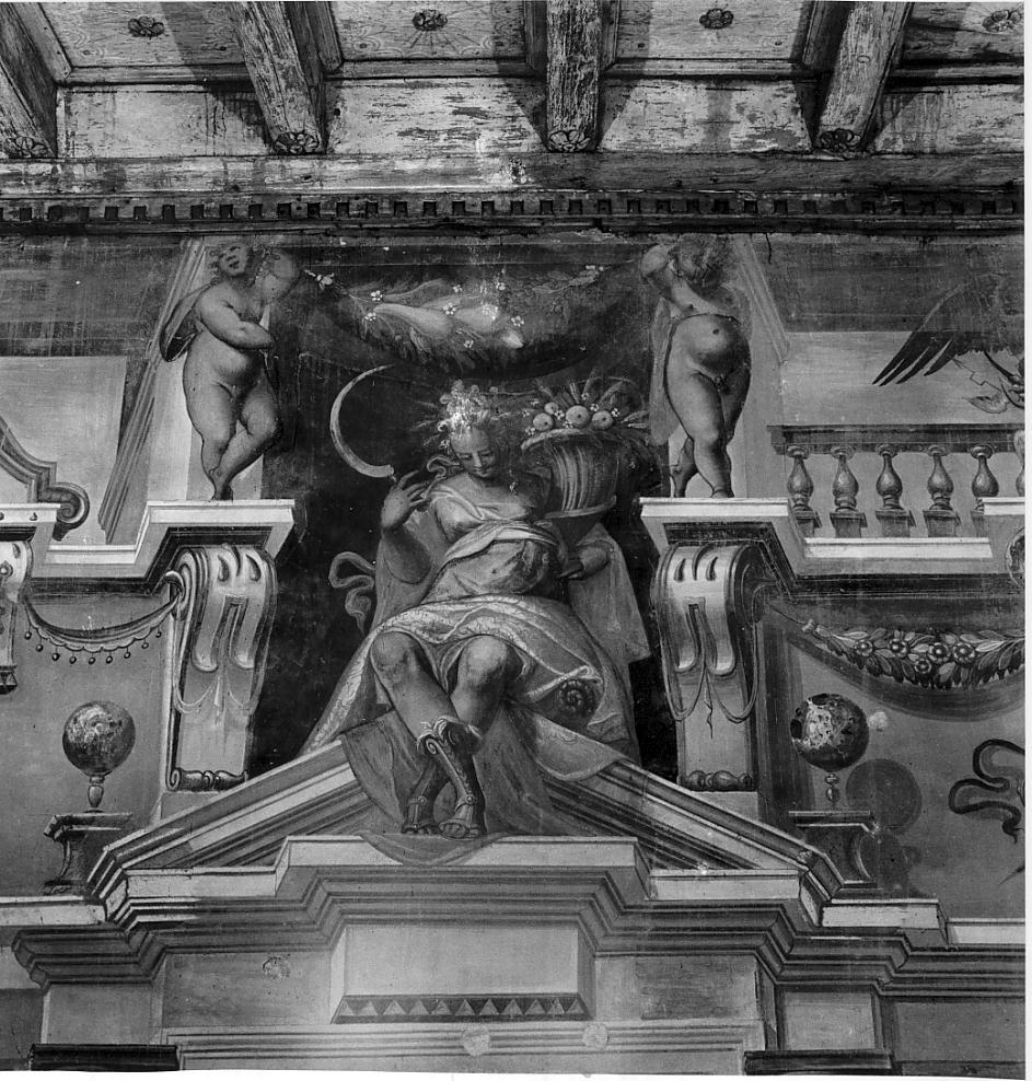 La divinità, che indossa una veste rosacea, una sopravveste azzurra e un mantello verde rabescato, impugna con la destra una falce messoria e con la sinistra tiene una cornucopia con frutti e messi; la sua acconciatura è adorna di spighe