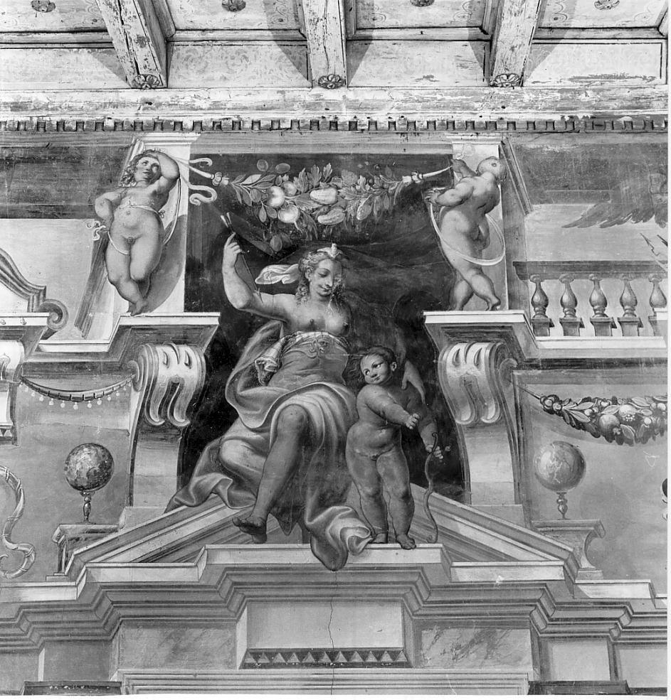 La dea dell'amore è dipinta a seni scoperti, con veste bianca a righe rosse, sopravveste azzurra e manto giallo cangiante in rosso; l'acconciatura ha un fermaglio a forma di colomba. Venere tiene con la destra una freccia e con la sinistra cinge le spalle al piccolo Amore, che sta tendendo l'arco