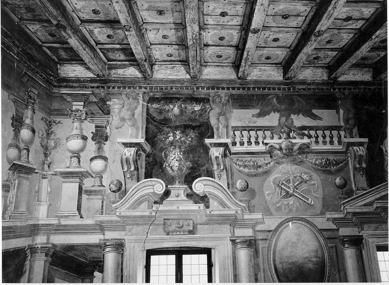 Al di sopra delle finestre della Galleria sono dipinti timpani triangolari o a volute contrapposte; due mensole retrostanti reggono due putti in vario atteggiamento. Nello spazio centrale, quando non è raffigurata una Virtù, è dipinto un vaso, variamente ornato, con un cespo di fiori e frutta