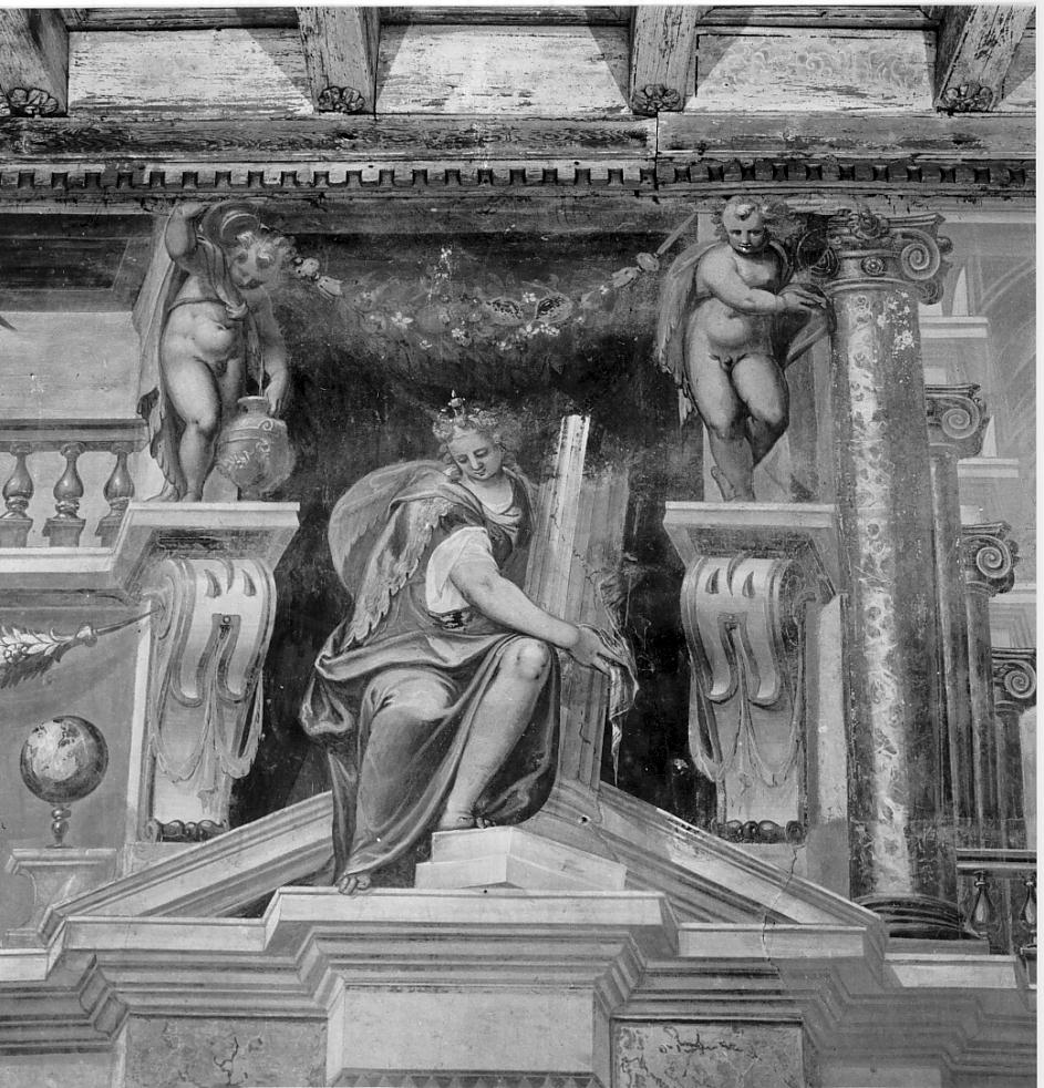 La Virtù, vestita di verde con sopravveste giallo-oro e ampio mantello dentellato rosso cangiante in azzurro, afferra una colonna dalle ampie scanalature