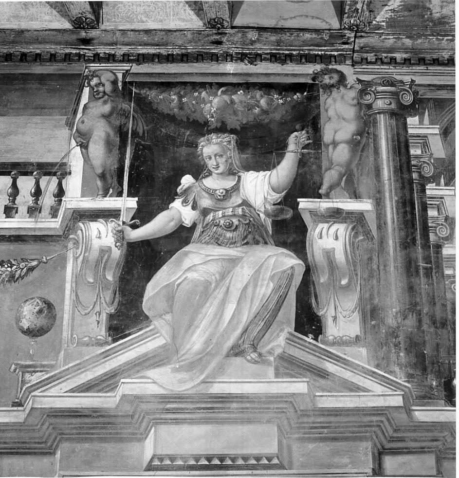 La Giustizia indossa camicia bianca, veste rigata con corpetto verde e fregi d'oro, mantello azzurro-argento, regge con la destra la spada e con la sinistra la bilancia