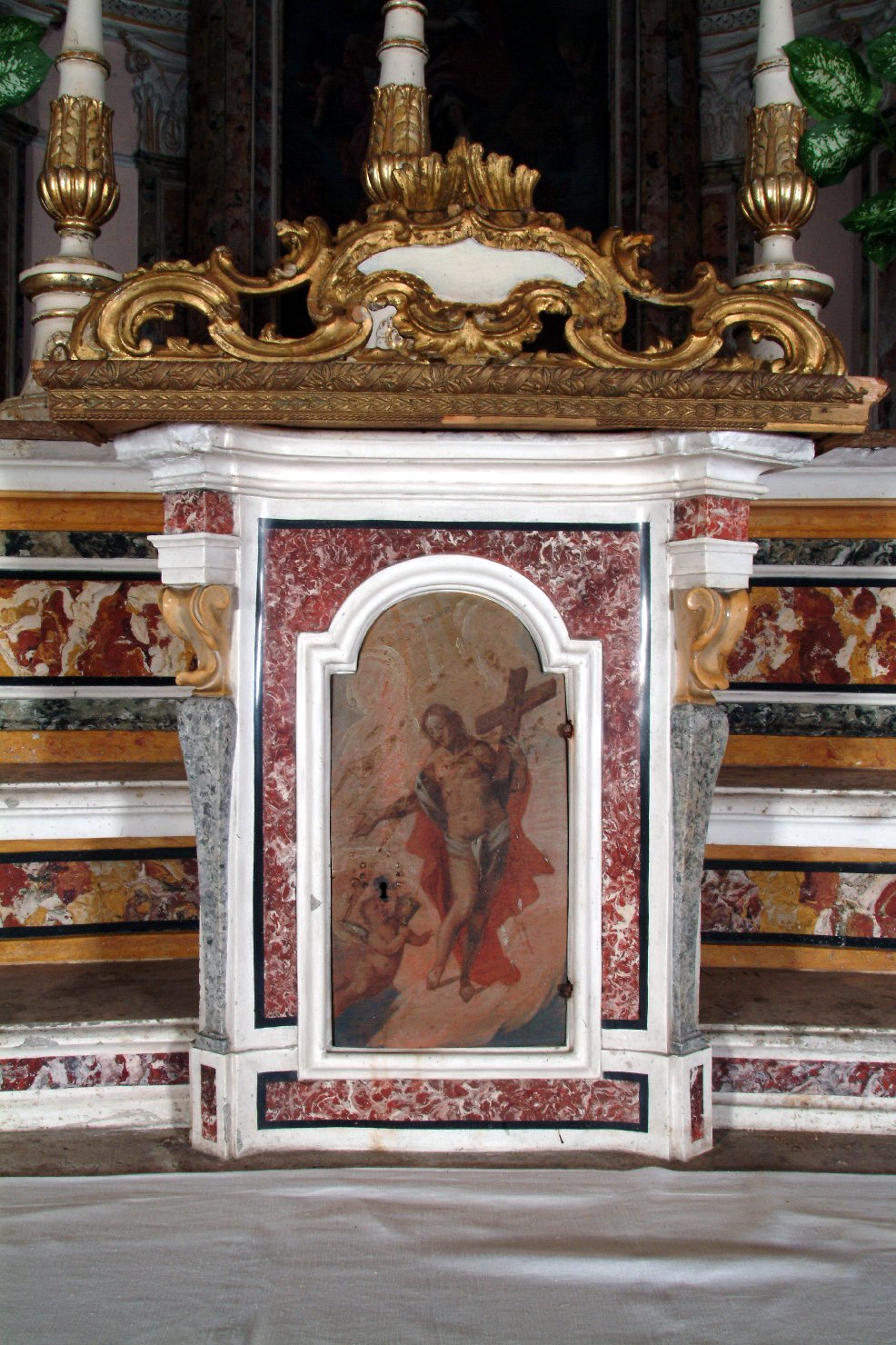 Tabernacolo ornato da due lesene ai lati con capitelli a voluta, sportello centinato con il Cristo risorto