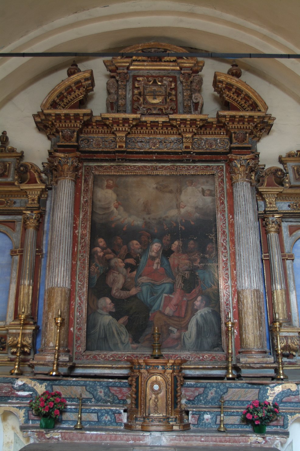 Due colonne scanalate sostengono un fregio con motivi a volute vegetali e mascheroni sormontato da timpano curvilineo spezzato con al centro cimasa. Il timpano è profilato da dentelli e mensoline. La cimasa reca un cartiglio con la Colomba dello Spirito Santo, sormontata da testina d'angioletto e con ai lati due erme