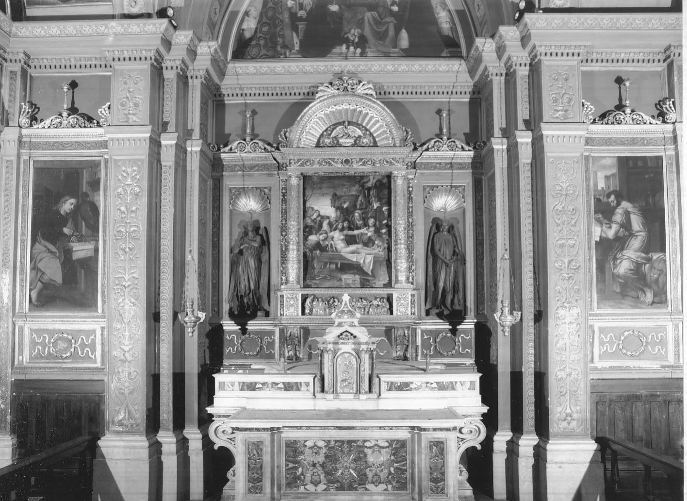 Mostre di nicchie ai lati dell'ancona centrale ella parete di fondo; cornici dipinte con fastigio a doppia voluta vegetale a rilievo, lesene dipinte con motivi a candelabra. Sotto le nicchie e i dipinti corone di alloro con nastri