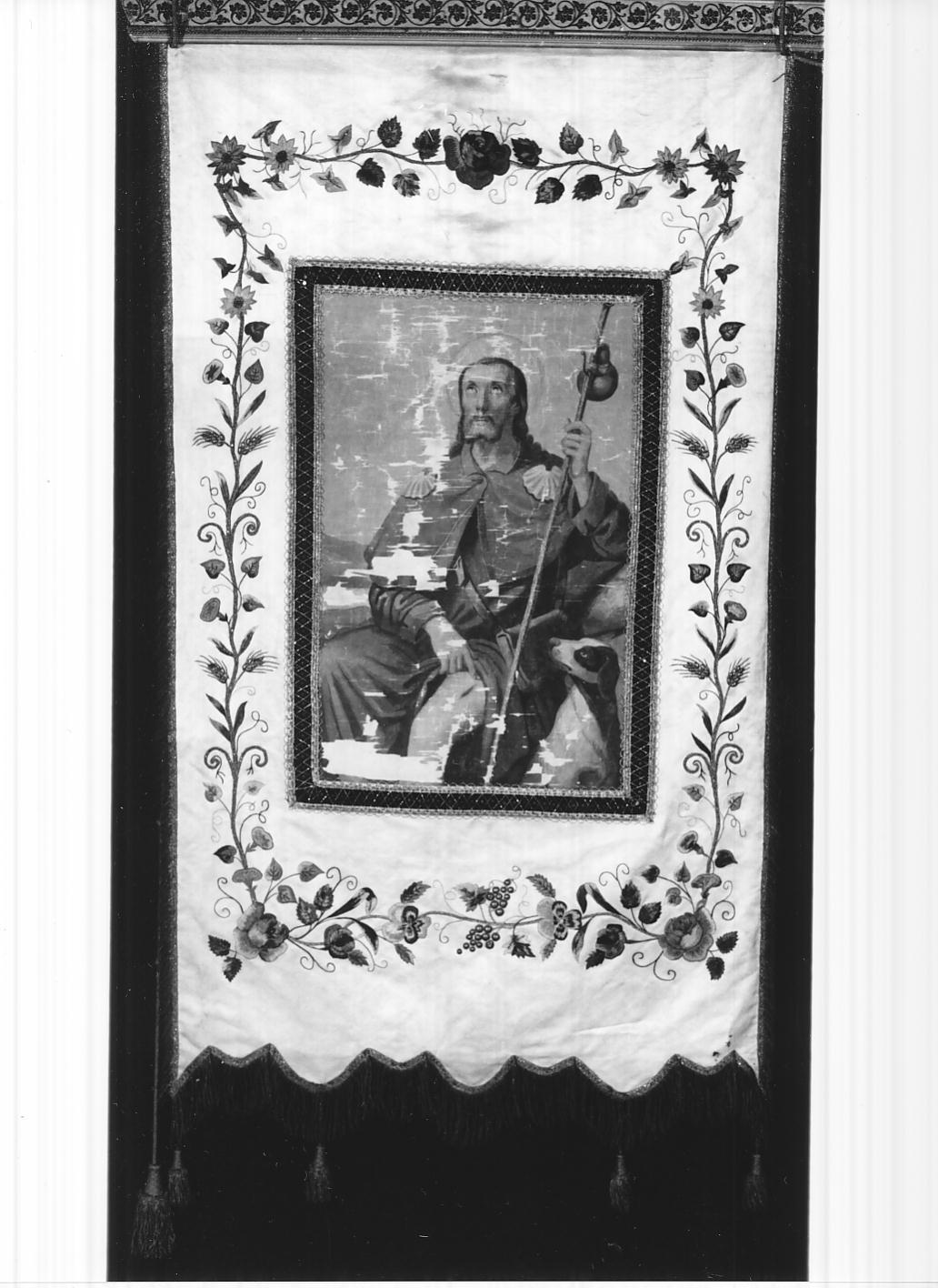 Stendardo processionale in raso avorio ricamato in fili di seta policromi, oro lamellare con motivi di fiori, spighe di grano, grappoli d'uva e con al centro, entro specchiatura rettangolare, San Rocco dipinto. Sul verso iscrizione a ricamo