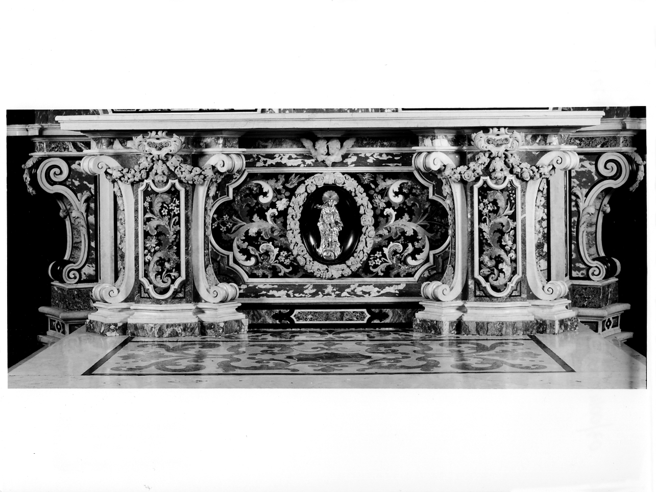 Sul paliotto e sui pilastrini laterali, entro specchiature in cornice mistilinea si sviluppano motivi floreali e vegetali in pietre dure su fondo nero