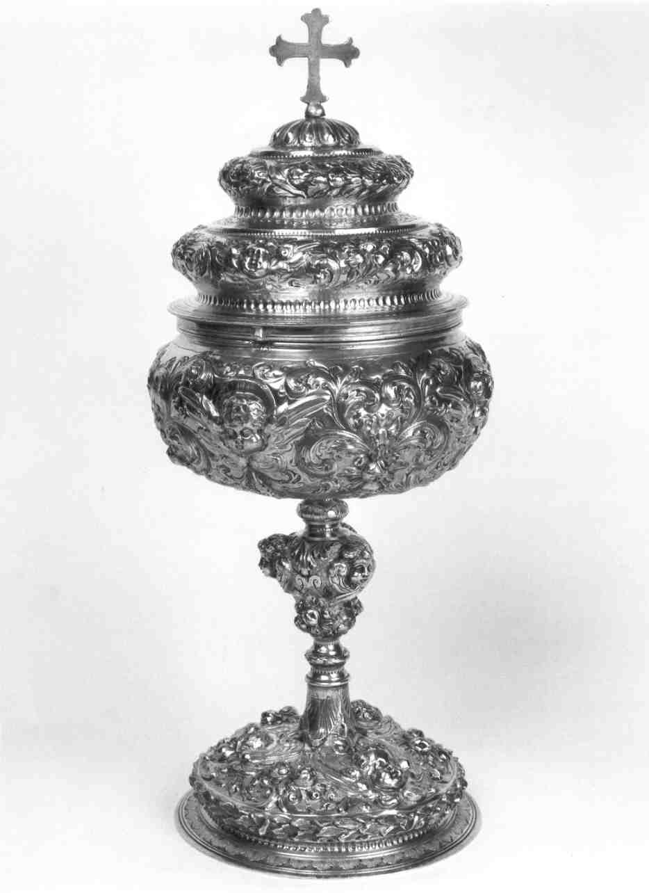 piede circolare con base ornata da cornice fitomorfa, ghiera, fascia a foglie di alloro e da testine angeliche alternate a grappoli di frutta, ripresi nel nel nodo piriforme tra collarini, nella coppa e sul coperchio, a gradini con ghiere e festone di frutta. Crocetta apicale con terminazioni trilobe poggiante su base baccellata