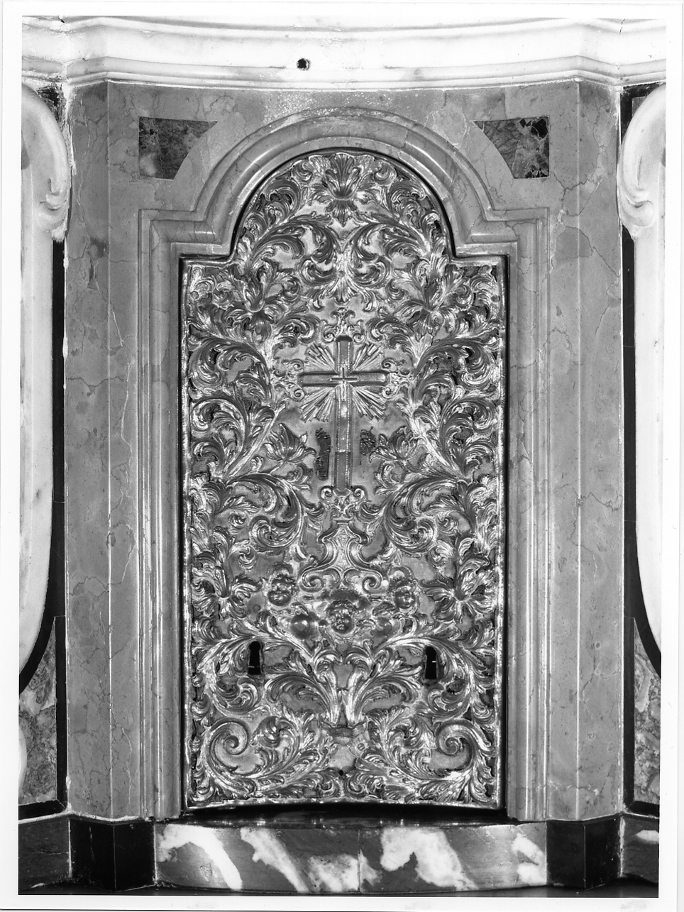 Sportello di tabernacolo con una ricca decorazione a volute vegetali con al centro una croce raggiata e testine d'angioletti. Fra i trafori della lamina si intravvede un tessuto di fondo rosso che ricopre lo sportello ligneo