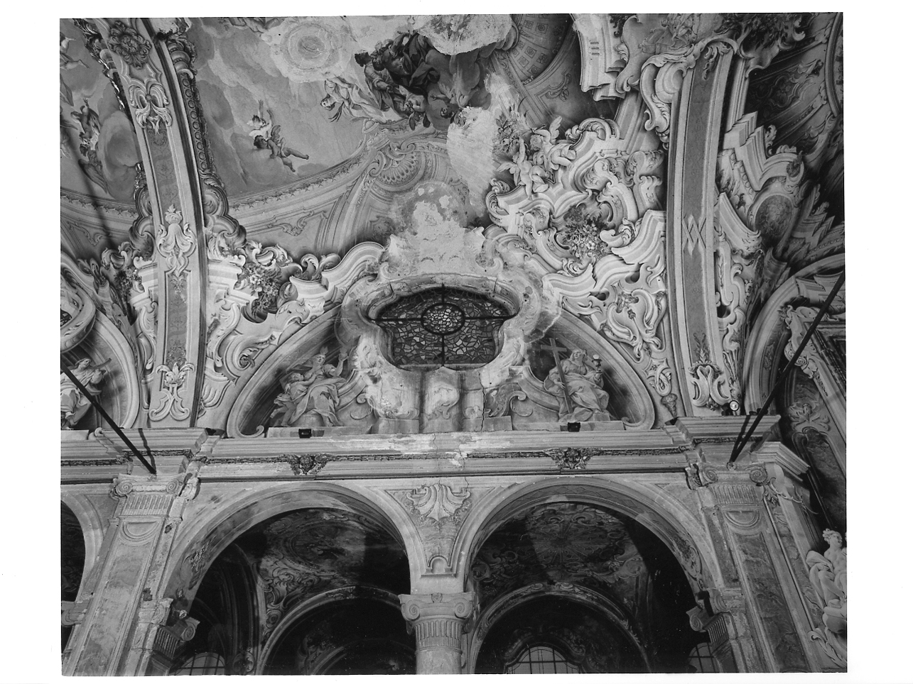 Personaggi: Carità; Fede. Attributi: (Carità) bimbo allattato al seno; cuore con fiamma. Attributi: (Fede) croce; calice con ostia