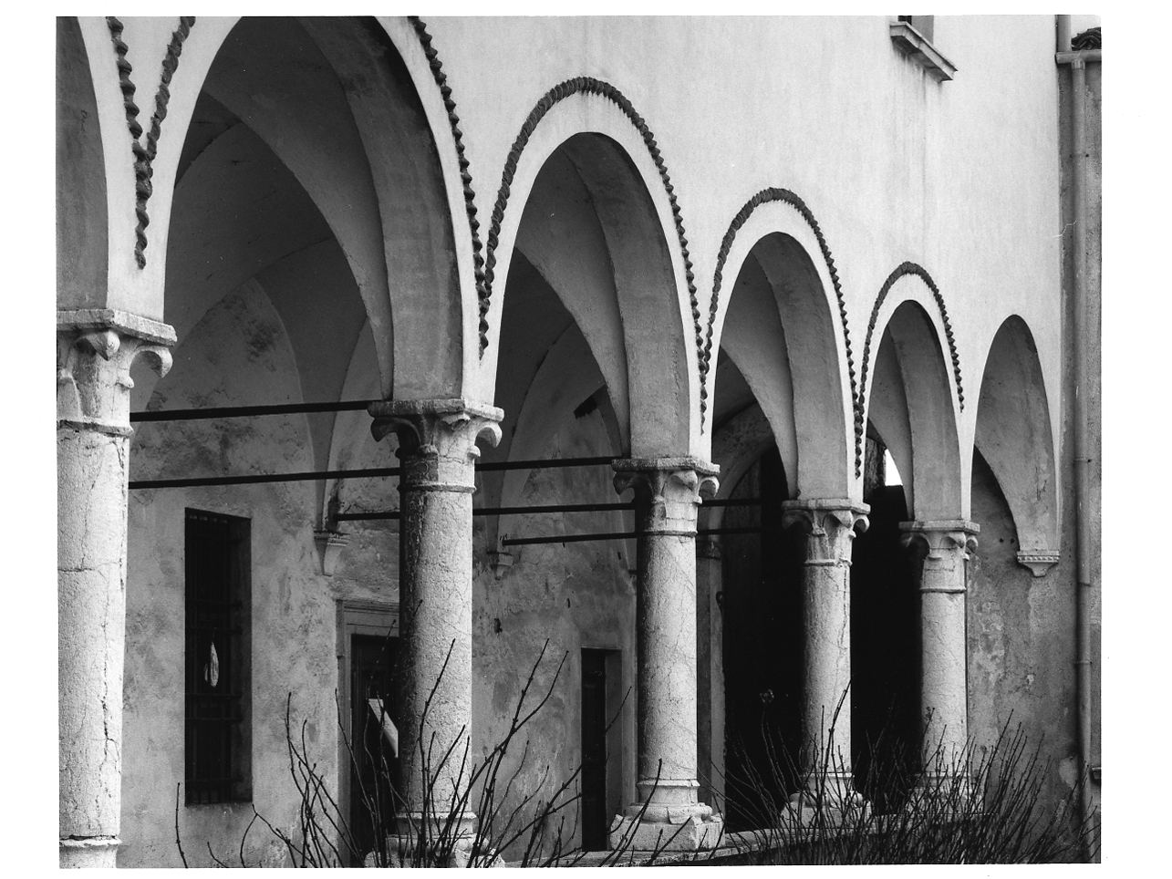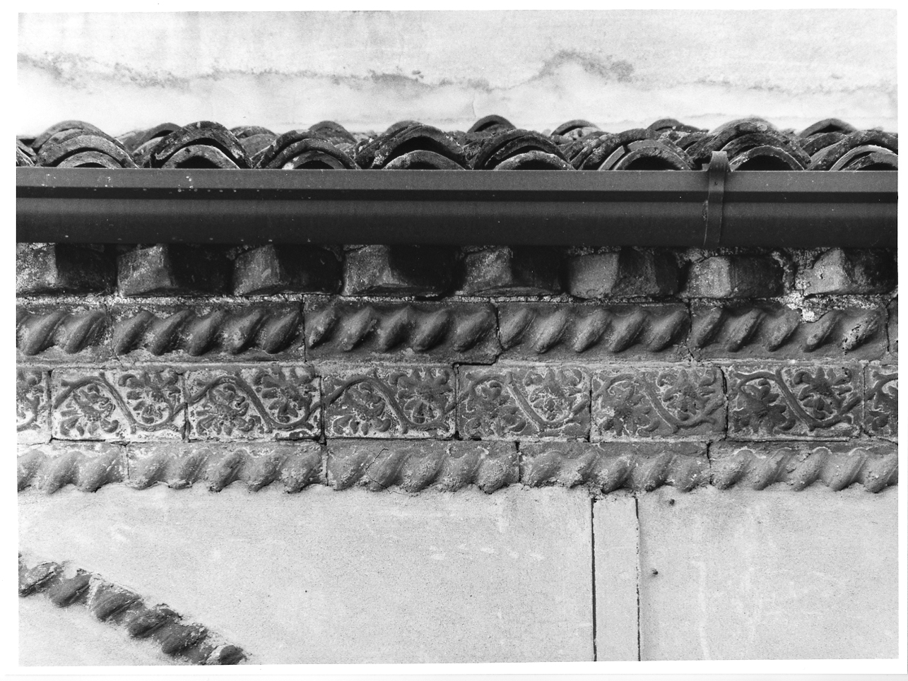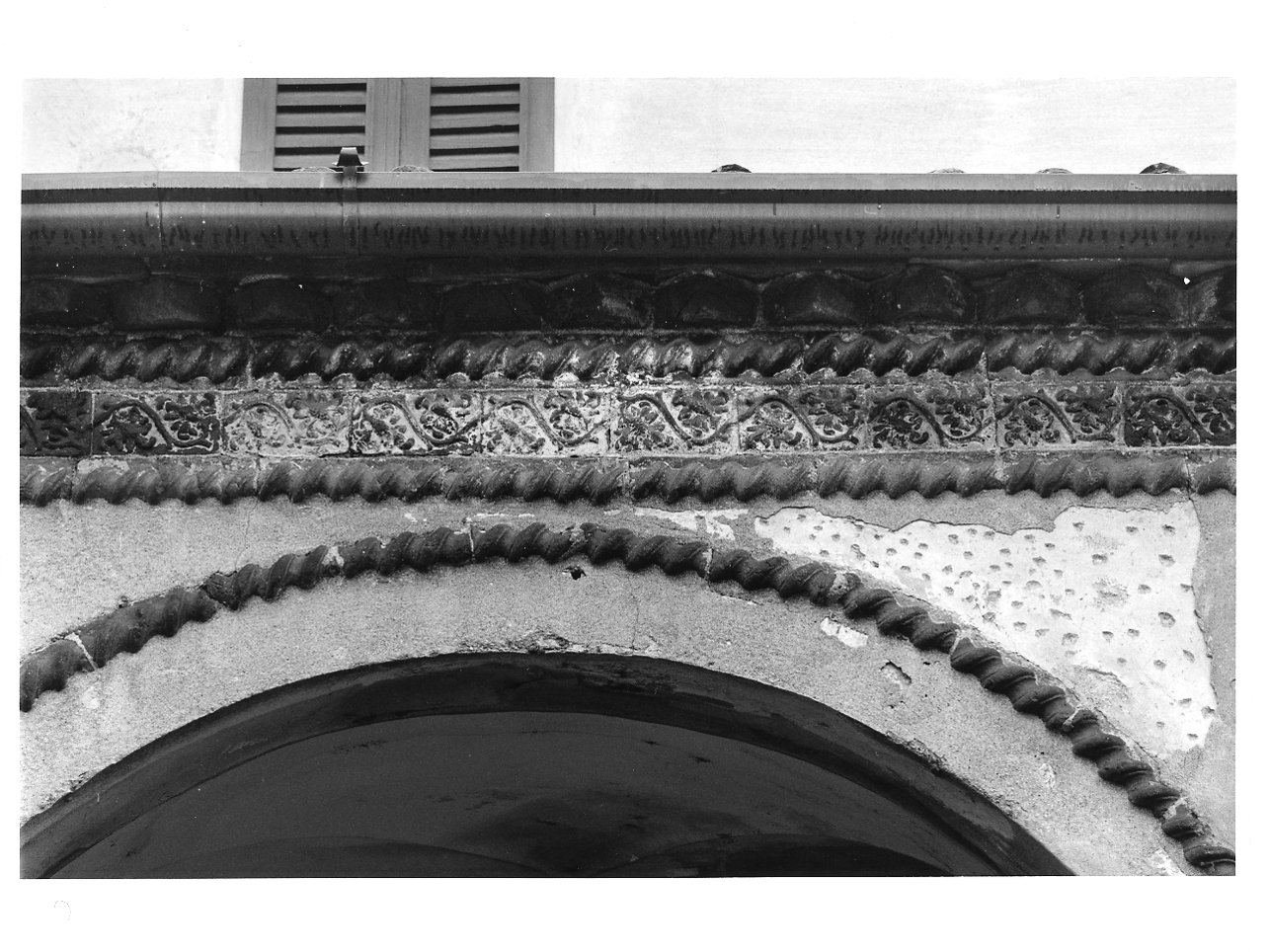 Fascia con tralcio vegetale dall'andamento sinuoso fra una doppia cordonatura. Cordonature costituenti le ghiere delle arcate
