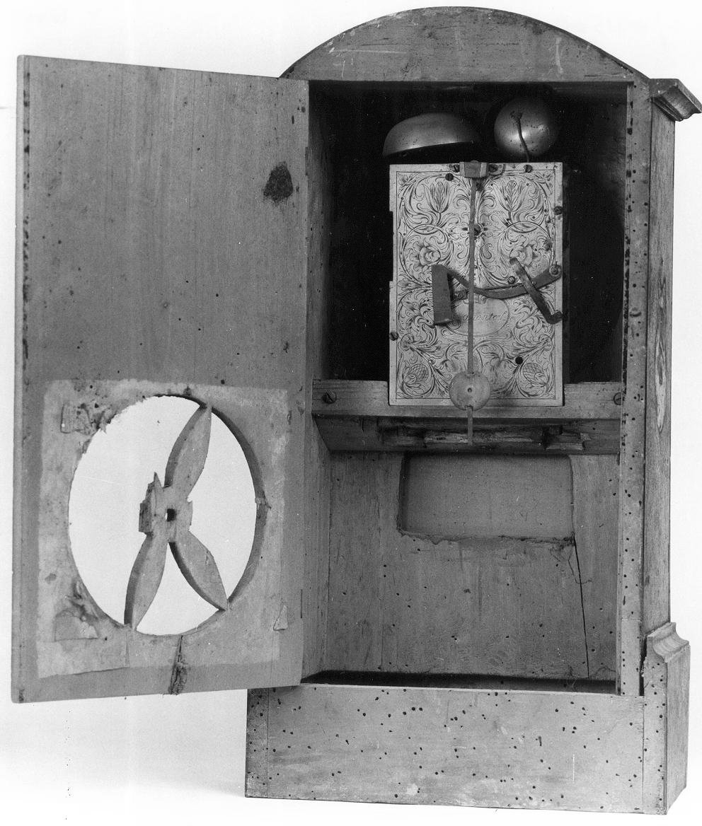 L'orologio ha configurazione lineare a sezione rettangolare. Il corpo centrale poggia su uno zoccolo modanato ed ha, sopra la cornice aggettante, timpano semicircolare. Il quadrante è tondo e presenta numerazione romana delle ore e araba dei minuti. Le lancette hanno sagoma e riccioli e volute. Alla base è applicato un motivo a festoni in lamina d'ottone stampata e nello stesso materiale, sotto il quadrante è applicata un'allegoria del tempo che, cavaliere, guida sulle nubi una biga trainata da una pariglia di cavalli alati