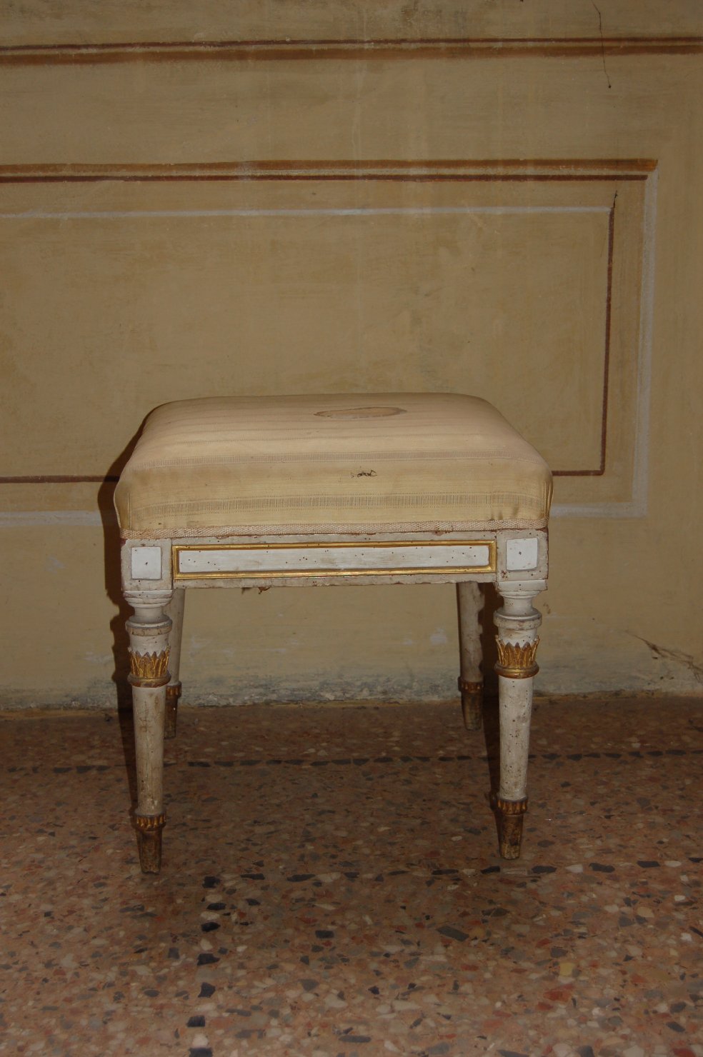 Lo sgabello, a 4 gambe, laccato di bianco con intagli dorati, presenta un sedile di forma quadrata imbottito con raso di seta color oro non originale. I 4 lati presentano specchiature con bordi a "scozia" e dorati; le gambe hanno una forma tronco-conica con goletta nel punto di raccordo con la mazzetta o dado angolato che presenta, su due facce, un motivo a rosetta; sotto la goletta una corona di palmette stilizzate; i piedi sui qulai permangono consistenti tracce di un'argentatura, sono definiti da un collarino dorato e scanalato