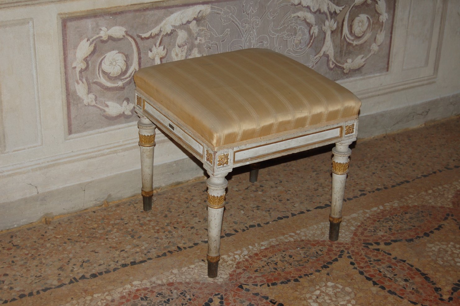 Lo sgabello, a 4 gambe, laccato di bianco con intagli dorati, presenta un sedile di forma quadrata imbottito con raso di seta color oro non originale. I 4 lati presentano specchiature con bordi a "scozia" e dorati; le gambe hanno una forma tronco-conica con goletta nel punto di raccordo con la mazzetta o dado angolato che presenta, su due facce, un motivo a rosetta; sotto la goletta una corona di palmette stilizzate; i piedi sui qulai permangono consistenti tracce di un'argentatura, sono definiti da un collarino dorato e scanalato