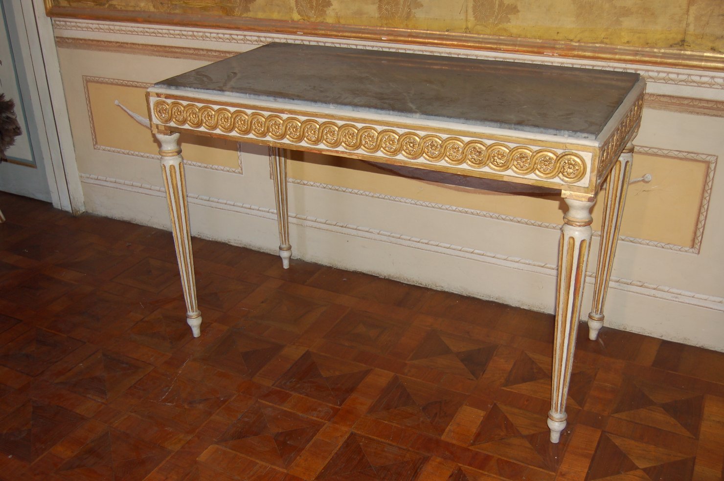 Tavolo da muro, rettangolare e laccato di bianco, con piano in marmo scuro incassato; su tre lati presenta, una decorazione a intaglio comprendente una treccia nei cui tondi si inseriscona da base quadrata o motivi a rosetta. Le quattro gambe, di forma troncoconica, con scanalature dorate, sono tornite e alla base e all'apice presentano una goletta sovrastata a raccordo con gli angoli del tavolo