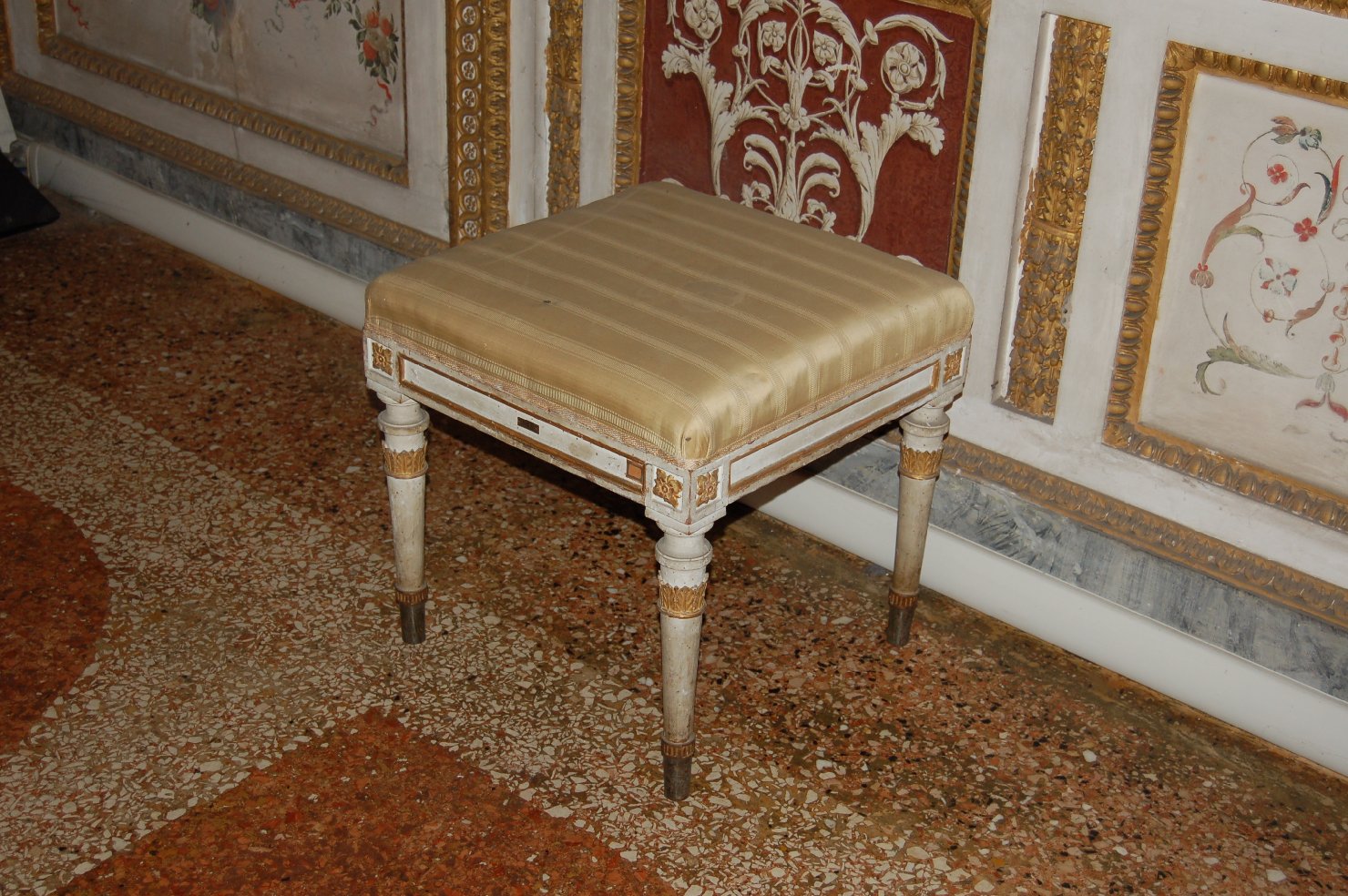 Lo sgabello, a 4 gambe, laccato di bianco con intagli dorati, presenta un sedile di forma quadrata imbottito con raso di seta color oro non originale. I 4 lati presentano specchiature con bordi a "scozia" e dorati; le gambe hanno una forma tronco-conica con goletta nel punto di raccordo con la mazzetta o dado angolato che presenta, su due facce, un motivo a rosetta; sotto la goletta una corona di palmette stilizzate; i piedi sui qulai permangono consistenti tracce di un'argentatura, sono definiti da un collarino dorato e scanalato