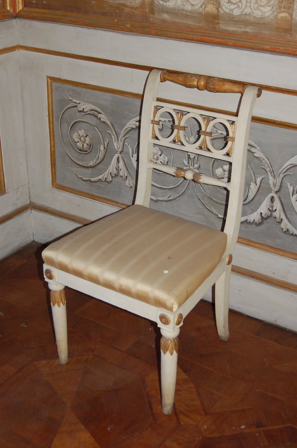 Sedia, laccata di bianco, con elementi dorati; schienale leggermente ricurvo con traversa centrale "a giorno" costituita da tre ovali con elementi dorati di giunzione e fasci fitomorfi interposti; le altre due traverse sono tornite a "balaustro" e decorate con corona di foglie a palmetta e sfera centrale. Il sedile è imbottito e rivestito di seta color oro. Le gambe posteriori sono a sciabola mentre quelle anteriori sono tornite e decorate nella parte superiore con corona di foglie a palmetta; i dadi angolari di raccordo presentano una applicazione dorata a forma di disco