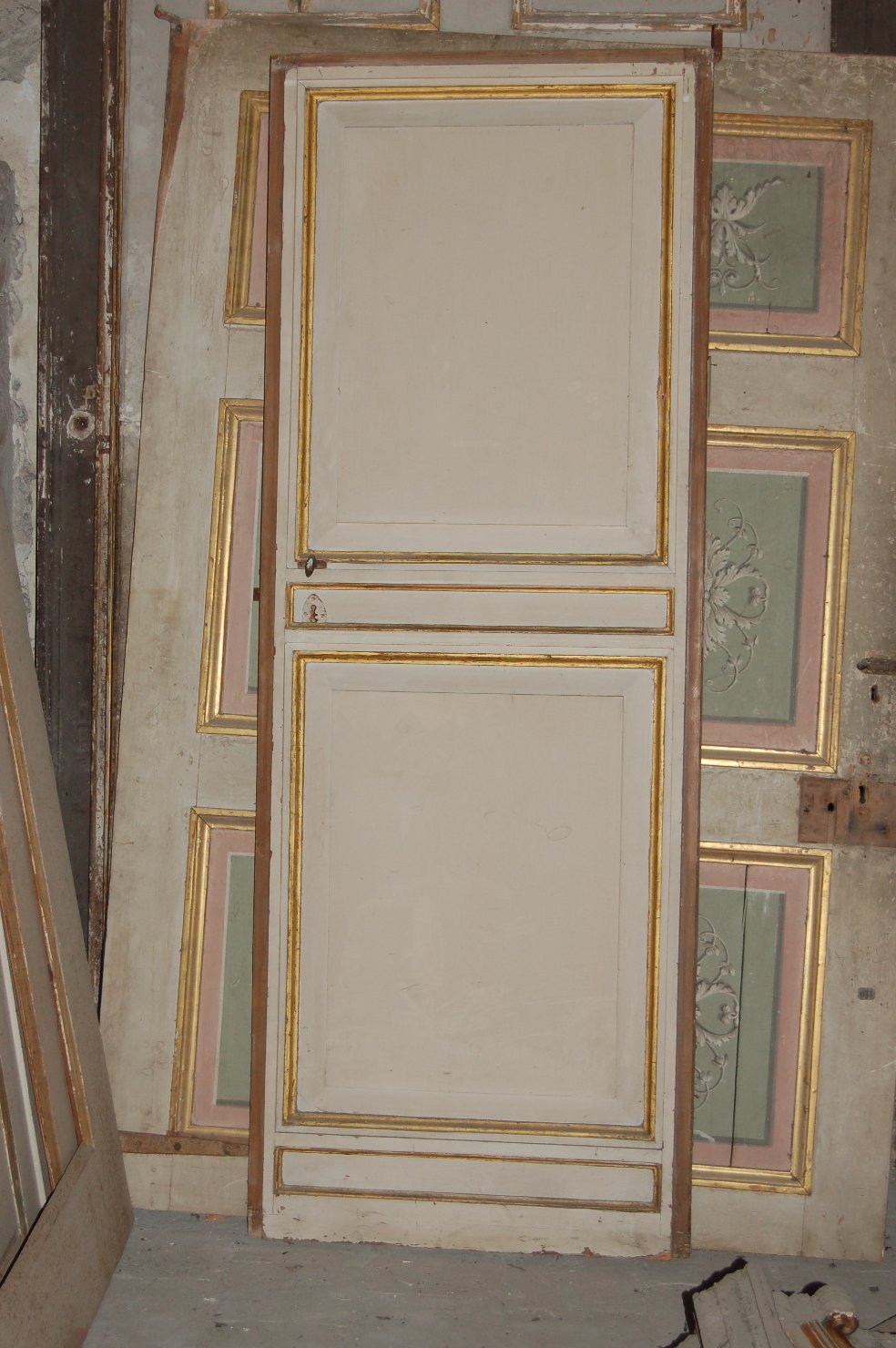 Porta a battente unico laccata di bianco su entrambi i fronti. Un lato presenta due grandi specchiature rettangolari con cornici modanate. L'altro lato alterna due grandi specchiature rettangolari con profilo dorato e sagome interne in lieve aggetto, ad altre due lunghe e strette specchiature rettangolari. Sistema di serratura con cassetta metallica e maniglie a forma ovoidale