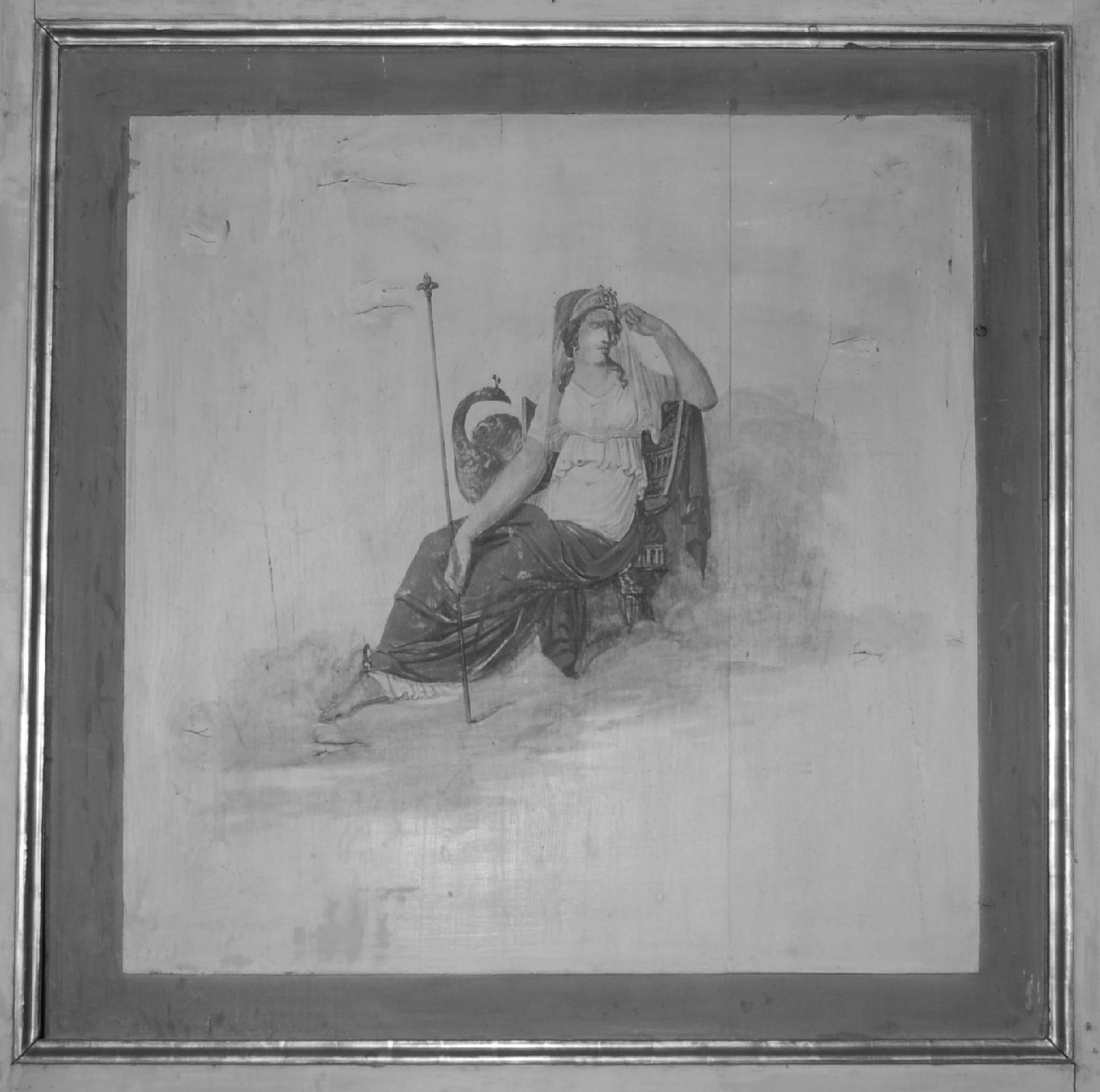 - NOTIZIE STORICO CRITICHE La linearissima conformazione della porta e le tenui colorazioni sono in stretta aderenza con l'arredo delle stanze di Giove e di quelle adiacenti che furono oggetto negli ultimi anni del periodo napoleonico (1811-1813) di interventi di rinnovo decorativo incentrati sui dipinti dei soffitti (Leda e il cigno, Giove e Giunone, Amore e Psciche). Non a caso le figurazioni dipinte sui fronti della coppia delle porte, di cui fa parte la presente, sono rivolte verso la saletta di Giove e comprendono figure mitologiche variamente legate alla prima divinità dell'Olimpo: la sua sposa Giunone e Ganimede il suo coppiere (nella presente porta); la figlia Minerva e, probabilmente Cerere (o Demetra alla greca) dalla cui unione con Giove nacque Proserpina. L'ambiente in cui si colloca la porta fa parte della Domus Nova, eretta tra il 1480 e il 1484 da Luca Fancelli per il marchese Federico I. La costruzione, mai terminata e forse progettata come un grande palazzo a pianta rettangolare, si articola su tre corpi; la facciata principale, completata con un restauro nel 1942, è rivolta verso il lago sul Giardino del Padiglione ed è affiancata da due massicce torri laterali coperte da logge con una fitta sequenza di finestre ritmate in due ordini sovrapposti. Fancelli, di formazione toscana, si documentò sui disegni eseguiti da Francesco di Giorgio per il Palazzo di Urbino e sicuramente trasse ispirazione dalle idee grafiche dei palazzi del Trattato del Filarete: la sua fabbrica, pur denunciando la derivazione da architetture castellane, sembra anticipare l'imponenza degli edifici cinquecenteschi. Solo ai primi del Seicento venne ricavato nella Domus Nova ad opera dell'architetto Antonio Maria Viani l'appartamento Ducale per Vincenzo Gonzaga, poi residenza quasi ininterrotta di tutti i duchi di Mantova e quindi del governatore imperiale. L'appartamento subì diverse trasformazioni: completato nelle decorazioni pittoriche sotto Ferdinando, fu riordinato da Carlo II dopo il sacco di Mantova (1630) e quindi dall'amministrazione austriaca dopo la caduta dei Gonzaga; ulteriori trasformazioni si ebbero nel 1811-13, come si è detto durante il dominio napoleonico. Restauri e allestimenti museografici del nostro secolo sono in parte responsabili del suo aspetto attuale