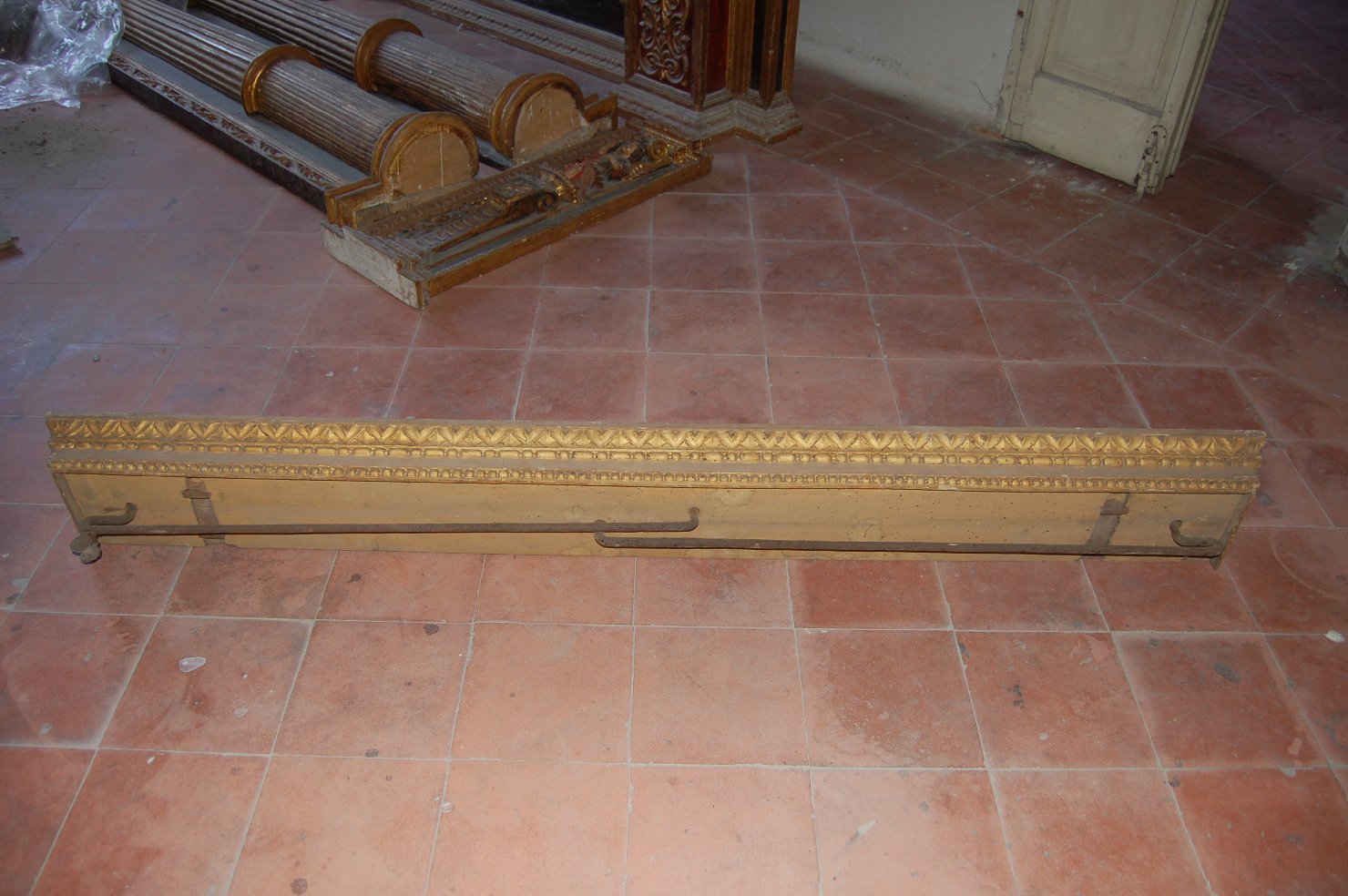 Elemento d'arredo in legno, intagliato e dorato, munito di traerse in ferro nella parte inferiore, utilizzate molto probabilmente per il sostegno e lo scorrimento di tendaggi. Le modanature della trabeazione sono percorse da diversi motivi ornamentali: perline, fuseli alternati a perle, e fogliette lanceolate