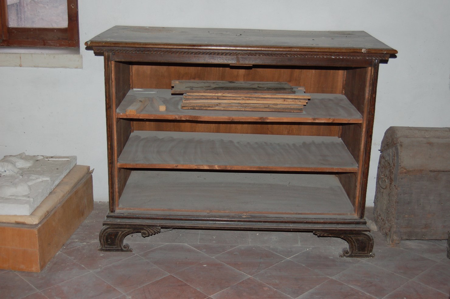 Mobile creato con funzioni di cassettone, fortemente rimaneggiato. Il pia no superiore liscio, sporge leggermente dal corpo sottostante con una cor n ice a becco di civetta sorretta da una cornice intagliata a dentelli. I va ni dei tre cassetti originari furono eliminati e le parti frontali, dec ora te da formelle a sagome geometriche mistilinee, furono tagliate in due par ti così da formare complessivamente sei ante, di cui una andò success ivame nte smarrita. I piedi a mensola con piccole specchiature presentano termin azioni a ricciolo. I fianchi con piedi dalla conformazione del tutt o ugual e, presentano specchiature rettangolari cieche delimitate da sotti li bordi modanati