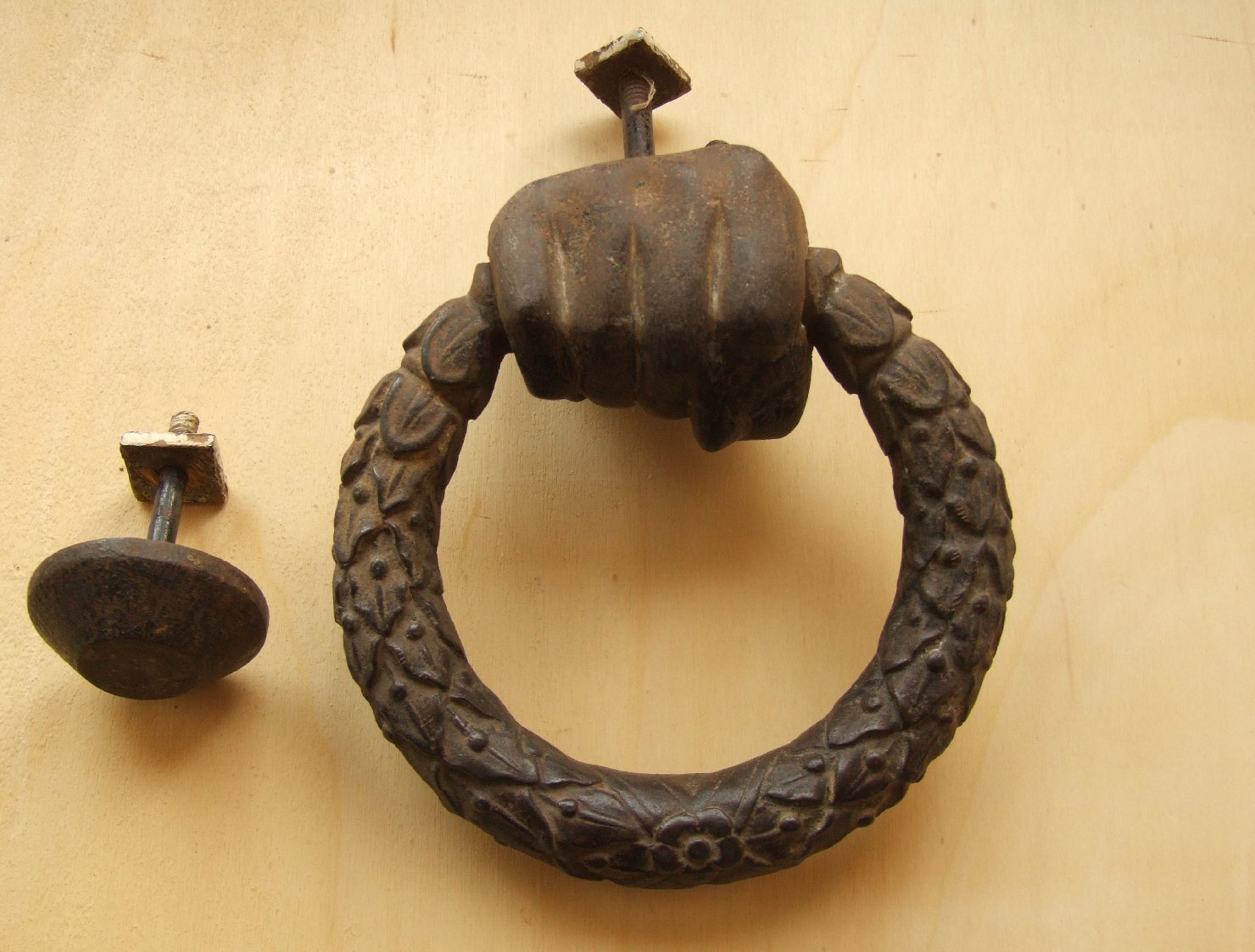 Picchiotto in ferro brunito, con battente circolare a forma di corona d'al loro impugnata da una mano chiusa a pugno in cui s'innesta il perno di fi s saggio; corredato di pomolo per l'apertura del battente della porta