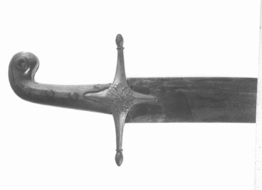 Impugnatura a calcio di pistola, in ottone/ guancette di osso legate da tre bottoncini in mezzeria e con osso guarnito/ elso a crocette, con crociera poco piramidale e bracci diritti a sezione piatta quadrata, decrescenti verso le estremità finite con olive/ corolla a sedici petali/ lama molto ricurva a un filo/ piatti sgusciati per tutta la lunghezza/ lama decorata in morsura con grande iscrizione in caratteri cufici su fondo rabescato/ fodero in pelle di pesce con lungo puntale in ottone gravato a motivi geometrici e fitomorfi con anello/ cappa in ottone con simile decoro e due campanelle legate a prismi tagliati a diamante/ privo di fascetta