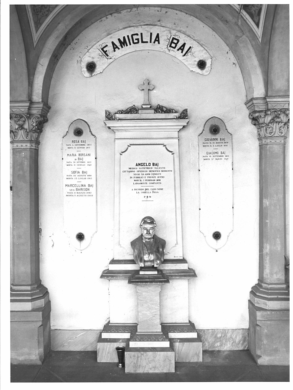 Monumento funebre della famiglia Baj. Busto - ritratto di Angelo Baj posto al centro della cappella funebre su un alto basamento. Dalla parete si aggetta una stele con iscrizione e coronamento con croce e conchiglie angolari. Ai lati due lastre tombali rettangolari con il profilo inferiore e superiore incurvato