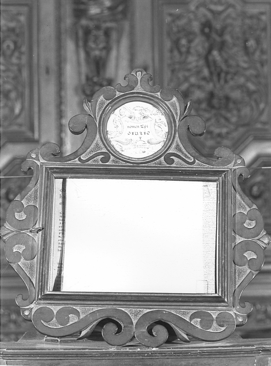 La cartagloria è costituita da una cornice a volute piatte su fondo "zigrinato", da una cimasa e due cartelle una rettangolare e una circolare