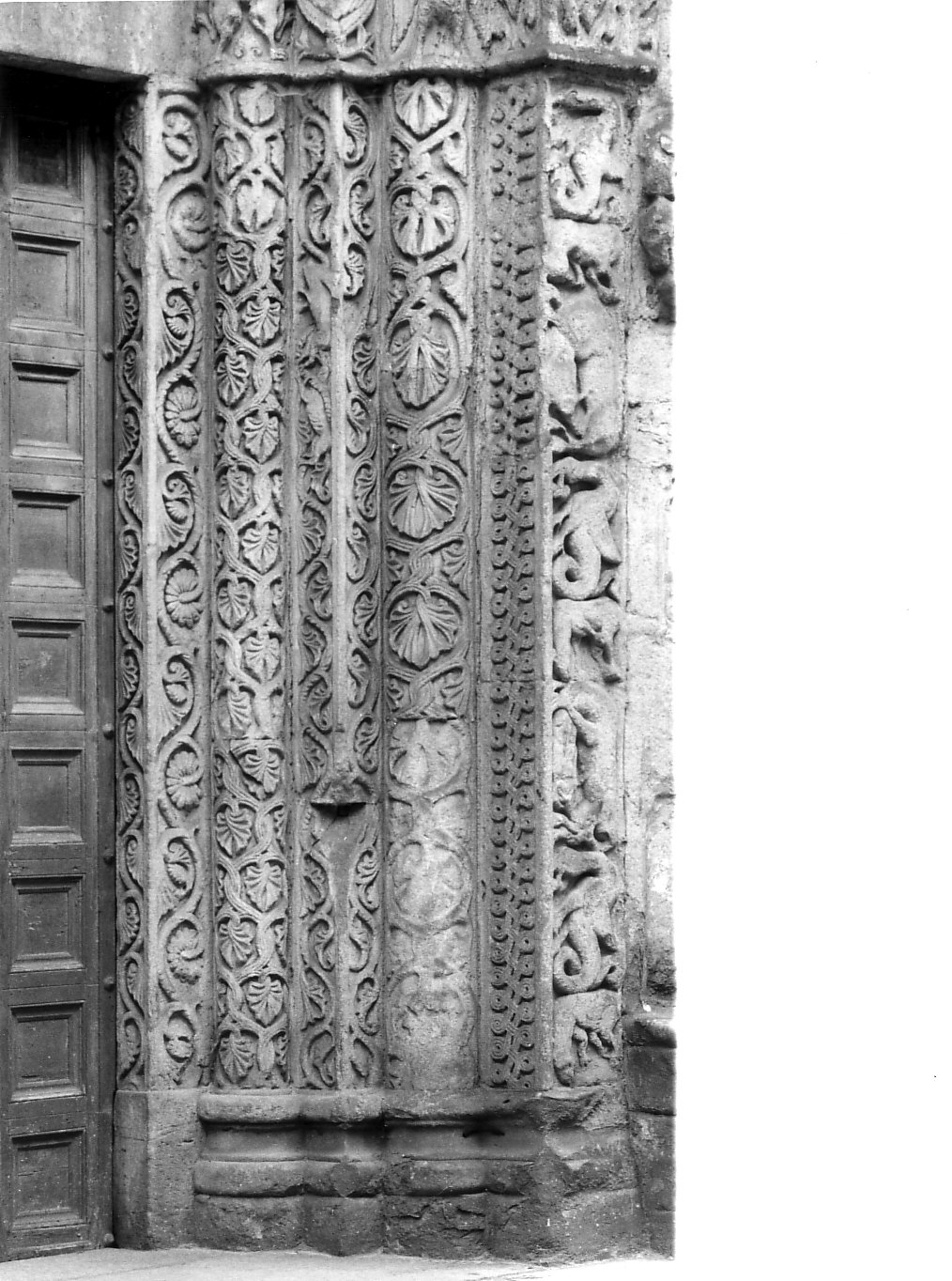 Decorazione plastica a rilievo degli stipiti a cinque fasce del portale centrale con formelle quadrate e palmette, intrecci e girali