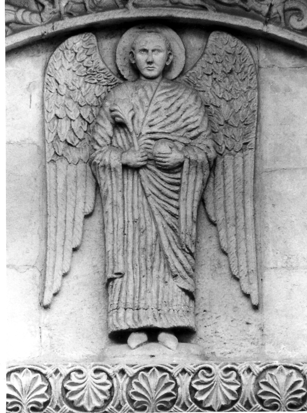 - NOTIZIE STORICO CRITICHE Bibliografia: G. CHIERICI, Le sculture della basilica di S.Michele Maggiore a Pavia, Milano, 1942; A. PERONI, San Michele di Pavia, Milano, 1967; C. DELL'ACQUA, Opere di restauro eseguite nella R.Basilica di S.Michele dall'anno 1860 al 1874, Pavia, 1875. L'opera fu eseguita durante i restauri del 1861 su modello dell'angelo del portale minore di sinistra, quando si provvide a sostituire la muratura della lunetta, su cui era dipinta l'immagine dell'Arcangelo Michele (F. De DARTEIN, Etude sur l'architecture lombarde, Parigi, 1865/82)